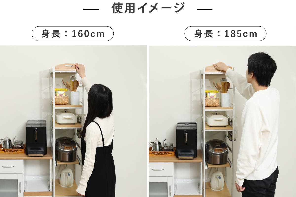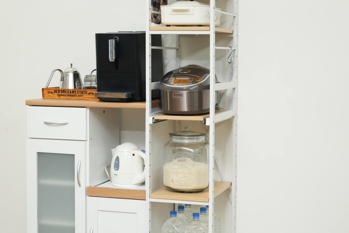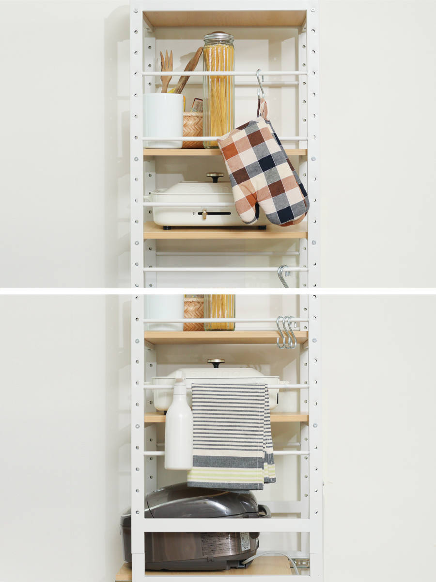 棚板は5cmピッチで高さを変えることができます。棚の高さを調節すれば、背の高い調味料やペットボトル、大きなキッチン家電も収納できて無駄がありません。