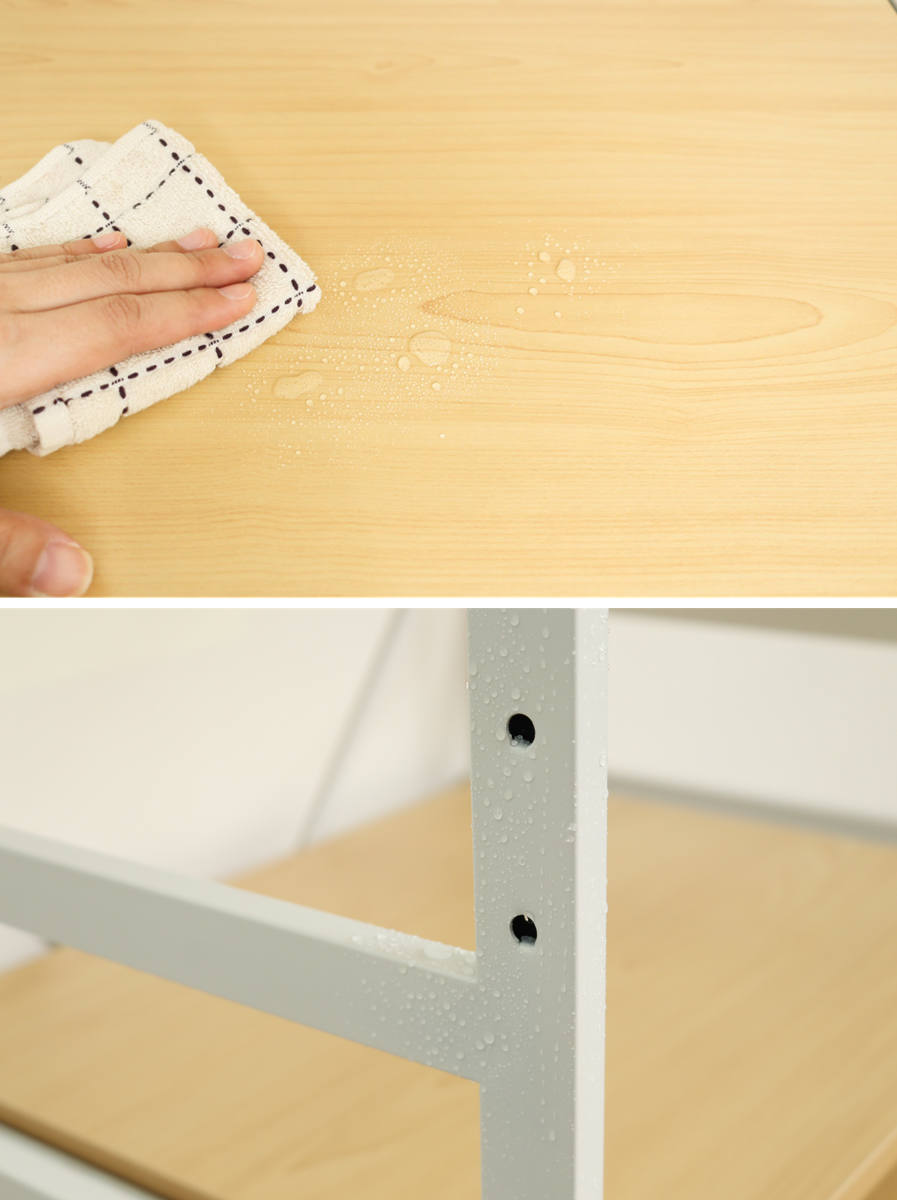棚板は水や汚れに強いメラミン化粧板、フレームは粉体塗装を施した頑丈なスチールを使用しています。汚れてしまってもサッと拭き取って簡単にお手入れOK。