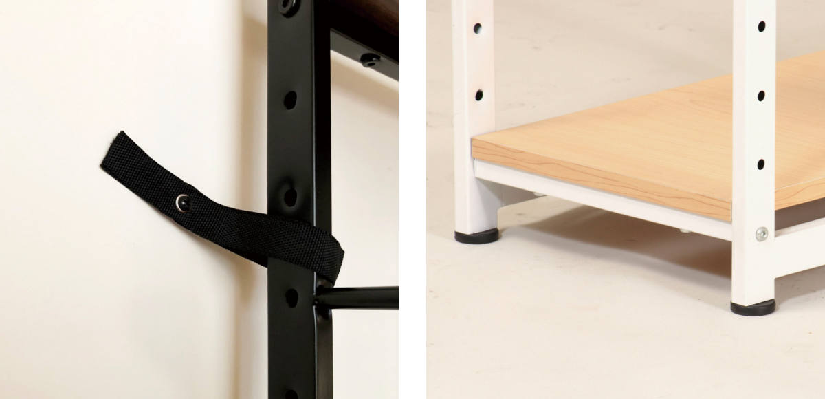 万が一の際の転倒を防ぐ転倒防止バンド付きです。フレームと壁面を固定してお使いください。