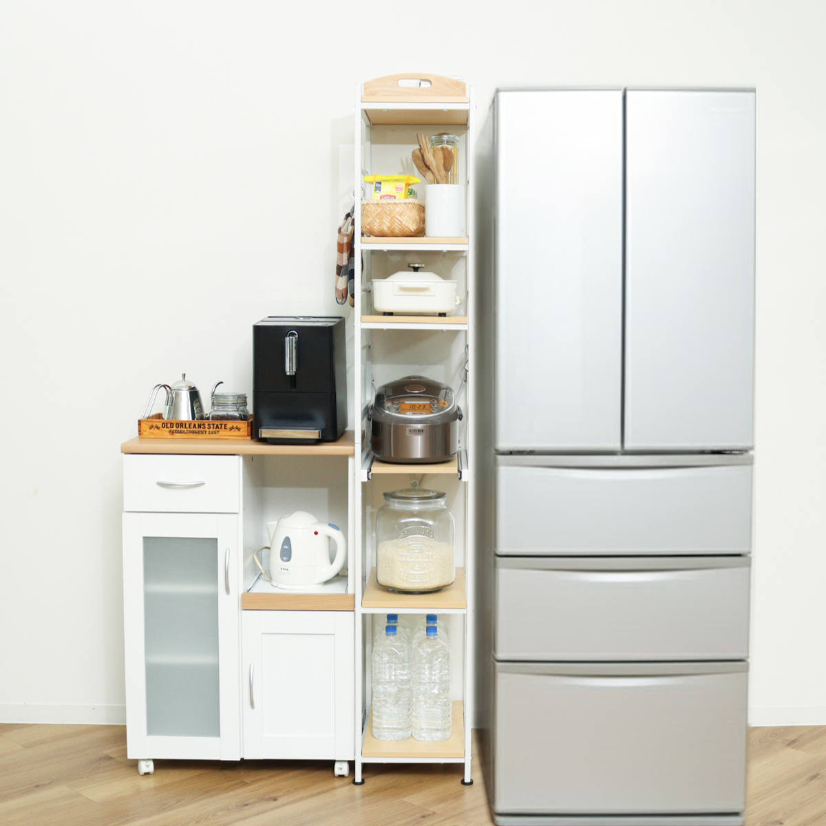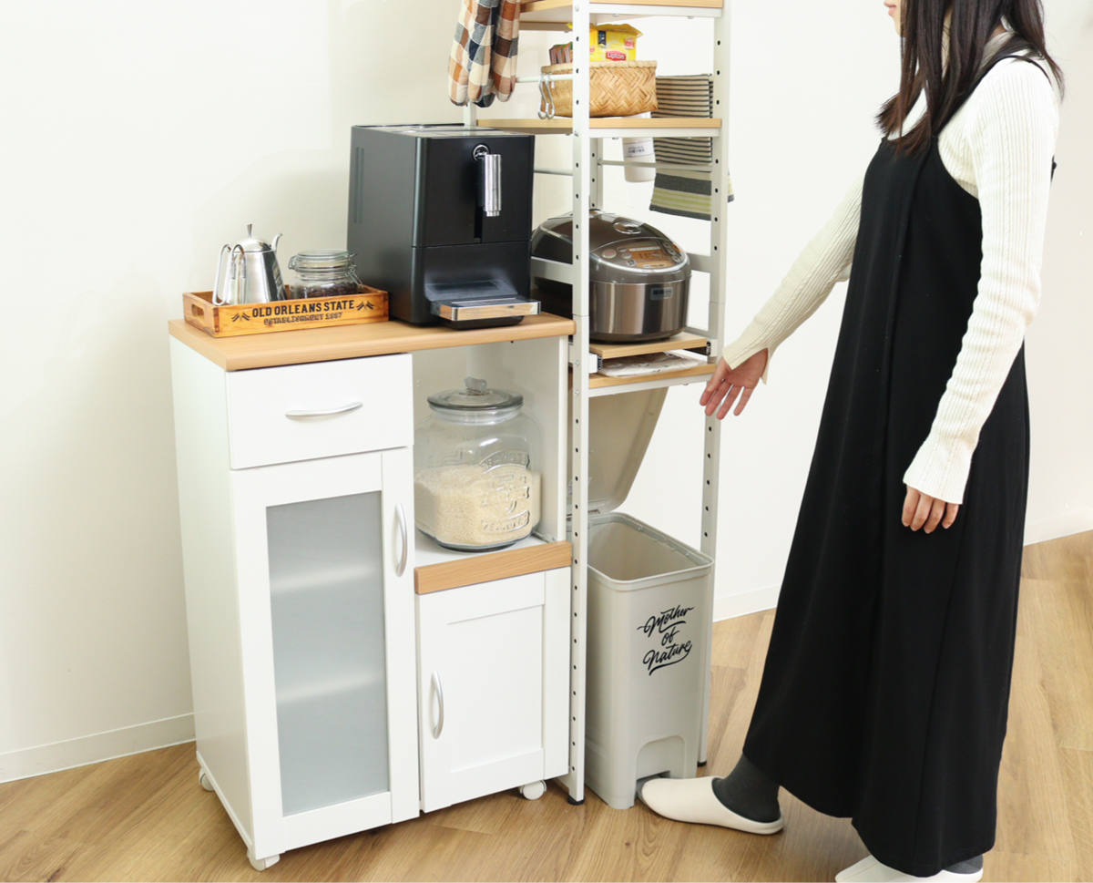 キッチン家電や食品のストックをひとまとめに収納できるキッチンラックです。幅30cmのスリムなサイズで、スペースに限りのあるキッチンのちょっとした隙間にも収まります。