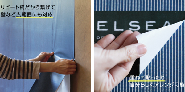 シートのデザインはリピート柄なので、繋げて壁などの広範囲にもお使いいただけます。また、違うデザインのシートを重ねて貼ったりすると、自分らしくアレンジすることもできます。