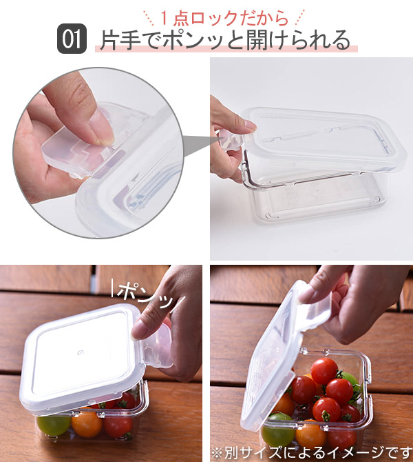 1ヵ所のみのロックでOKの画期的な保存容器です。1点ロックなので、片手でポンッと開けられます。フタの開閉がラクにでき、調理のちょっとした時短にもつながります。