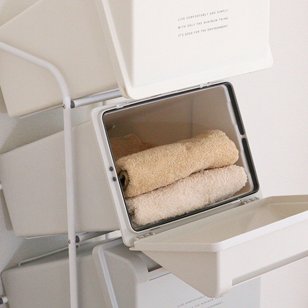 | 収納ケースとして スリムな形状なので洗面所の収納ケースとしても使えます。タオルを収納したり、白物・柄物と洗濯物の分別用にもおすすめです。 | おもちゃの収納場所にも 散らかったおもちゃも、種類ごとに分けて収納することができて便利です。 |