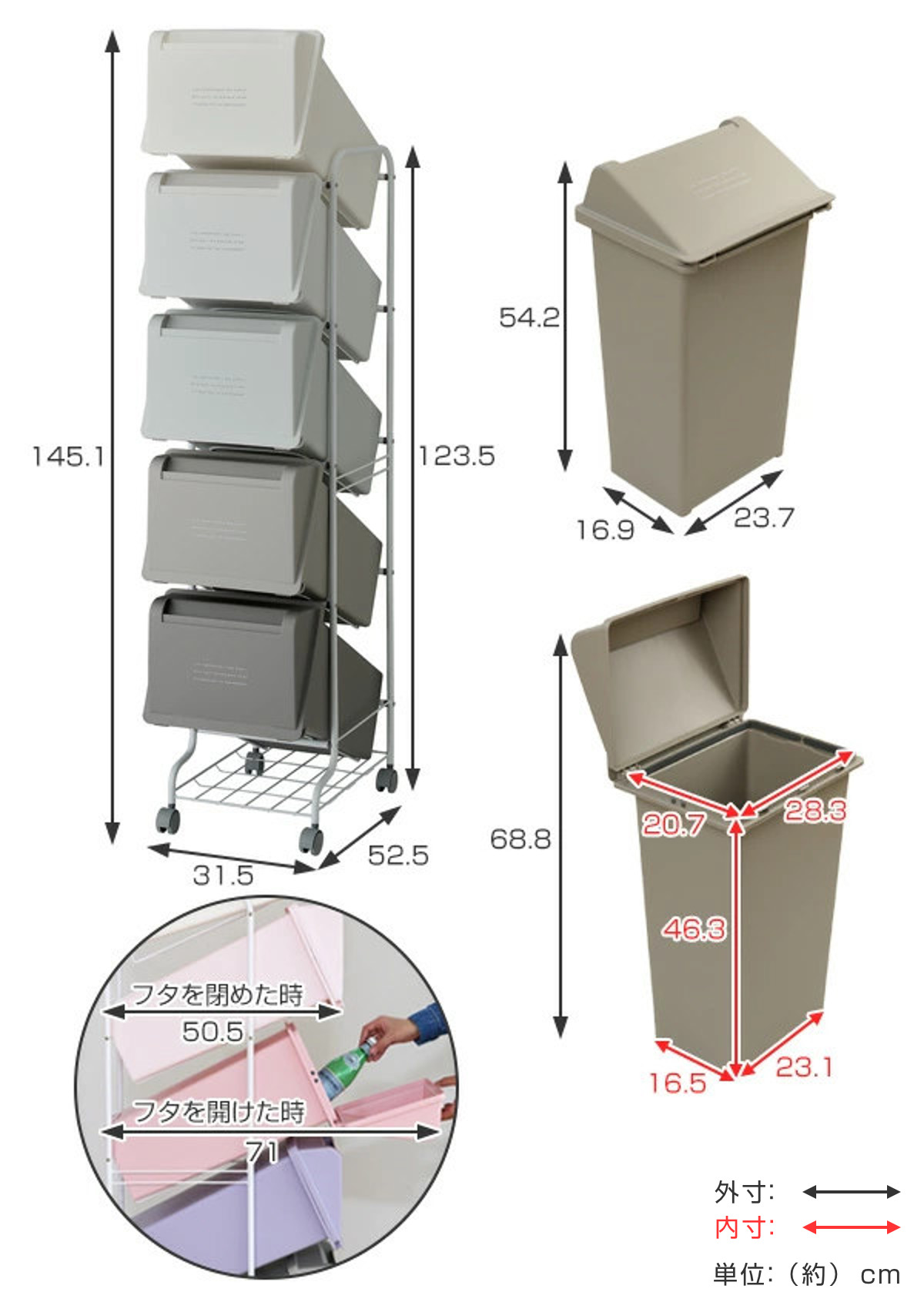 | サイズ | 約 幅31.5×奥行52.5×高さ145.1(cm) ゴミ箱:約 幅23.7×奥行16.9×高さ54.2(cm) |