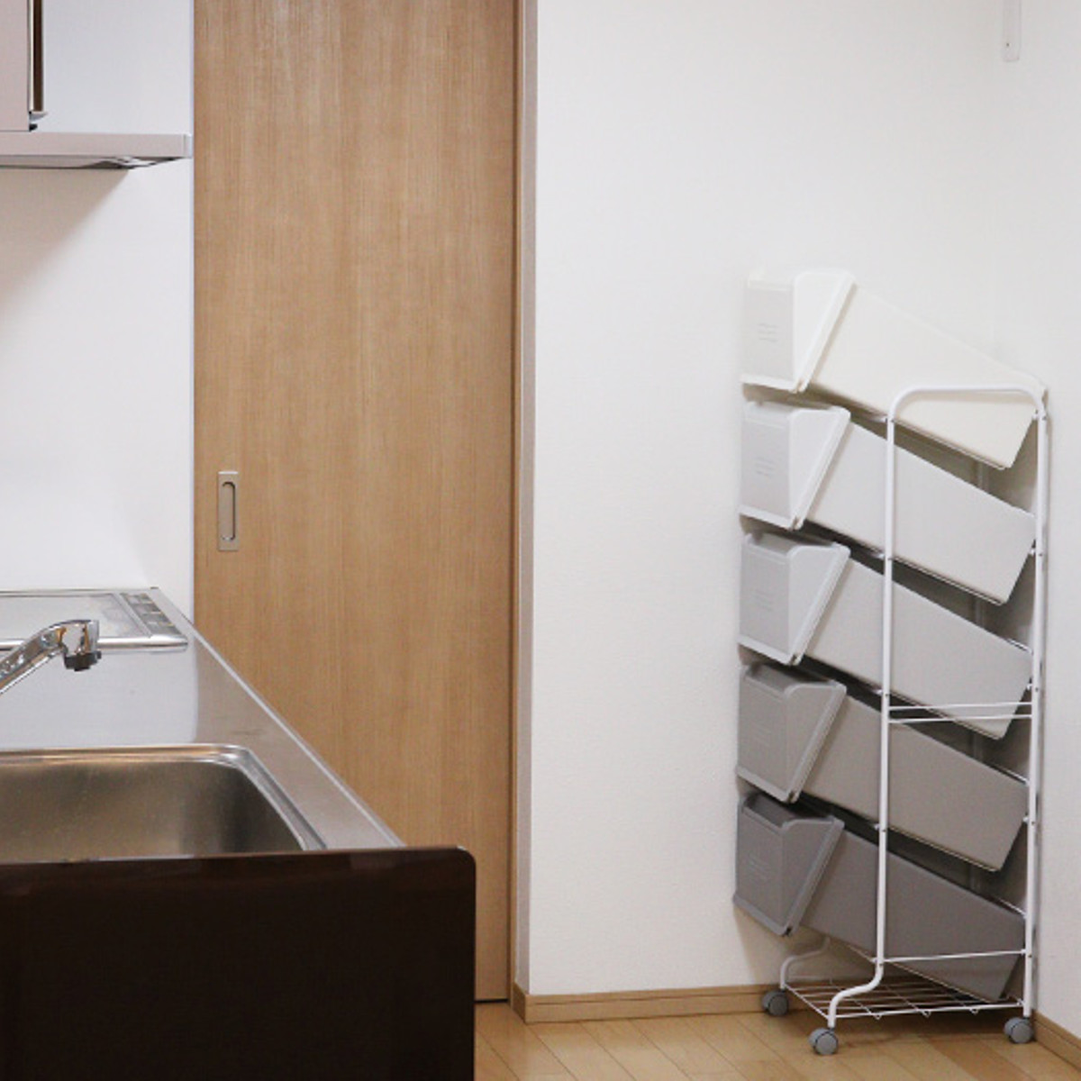 幅約31.5cmとスリムな設計なので、新聞紙の約一面分のスペースがあれば設置でき、家具や冷蔵庫などの隙間にスッキリ納まります。アパートやマンション、キッチン、洗面所など限られたスペースを有効活用できます。