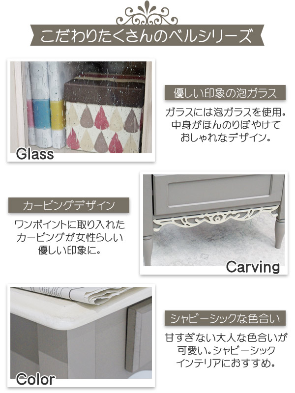 | ミラー ミラーは3mm厚で、飛散防止加工が施されているため安心です。 | フラワーモチーフのカービング 繊細な曲線で描かれた白のカービングデザインは、女性らしく華やかな印象を与えます。 |