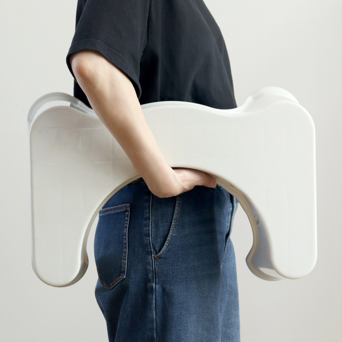 便器の下に収納できるU字型で、大人がトイレを使用する際も邪魔になりません。軽量なのでお子様でも便器の下から簡単に引き出せます。