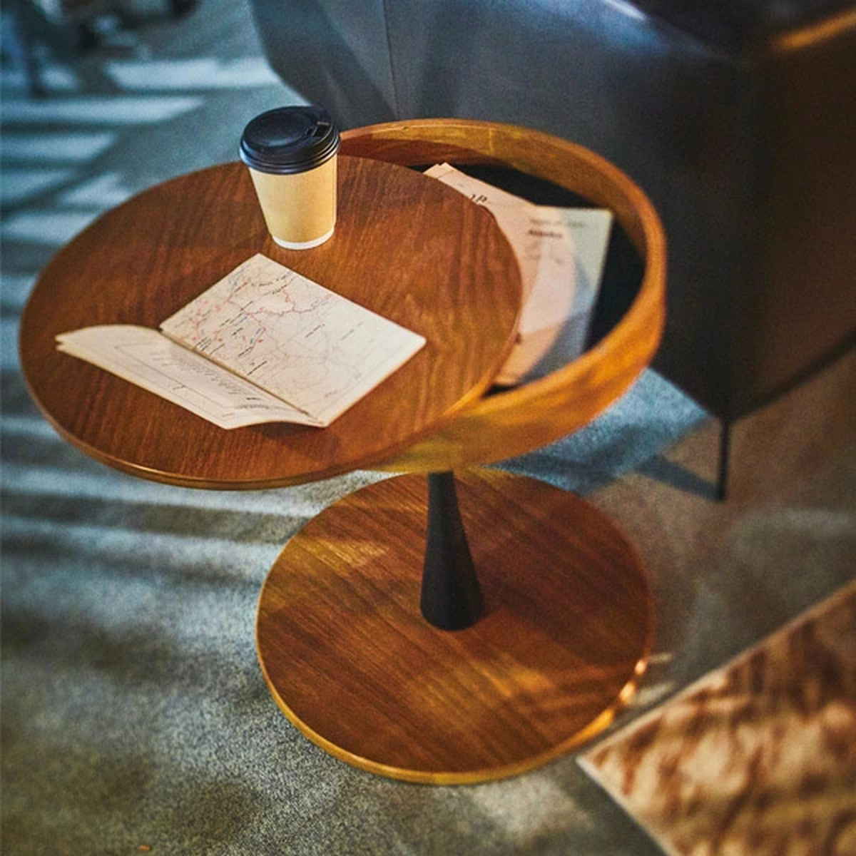 素材は天然木で高級感があります。天板と脚部分は、円形になっています。角のない丸いデザインで、高級感の中にも柔らかな印象を与えてくれます。