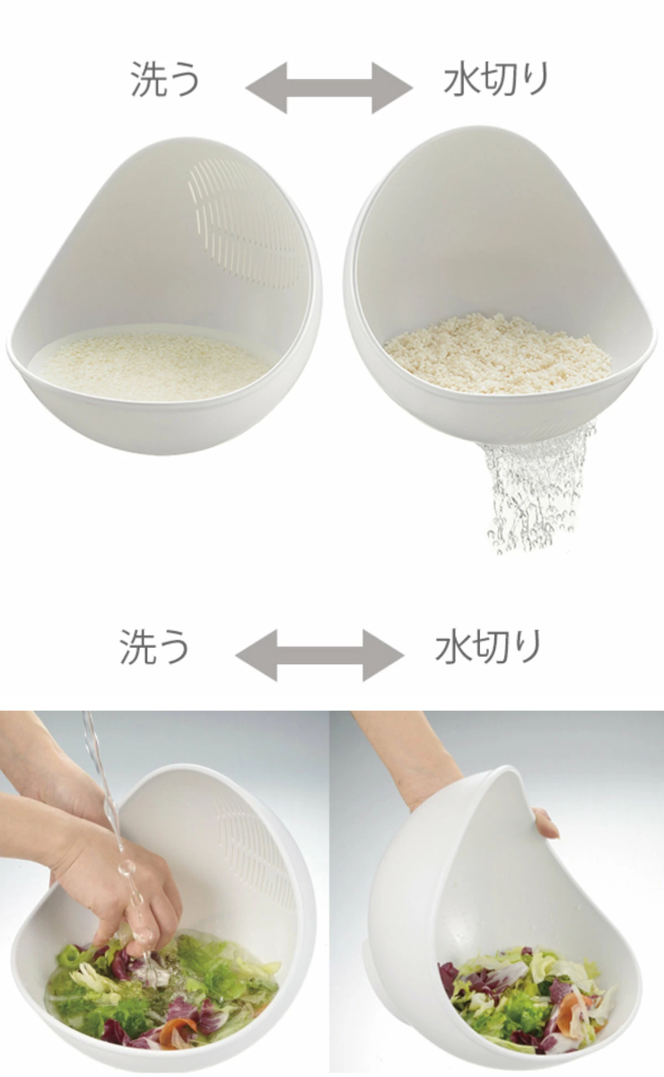 食材を洗った後そのまま傾けるだけで水切りもできる、ボウルとザルの機能を併せ持った便利な水切りボウルです。「洗う・和える・さらす・水切り」の4つの使い方ができます。ザルとボウルがこれひとつで済むので、洗う手間やしまう場所に悩まないのもうれしいポイントです。
