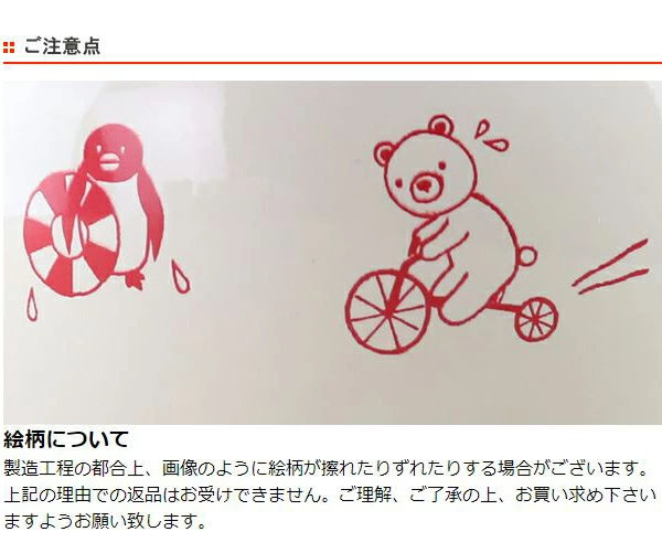 製造工程の都合上、画像のように絵柄が擦れたりずれたりする場合があります。上記の理由での返品はお受けできません。ご理解、ご了承の上、お買い求め下さいますようお願い致します。