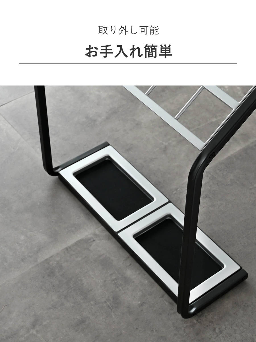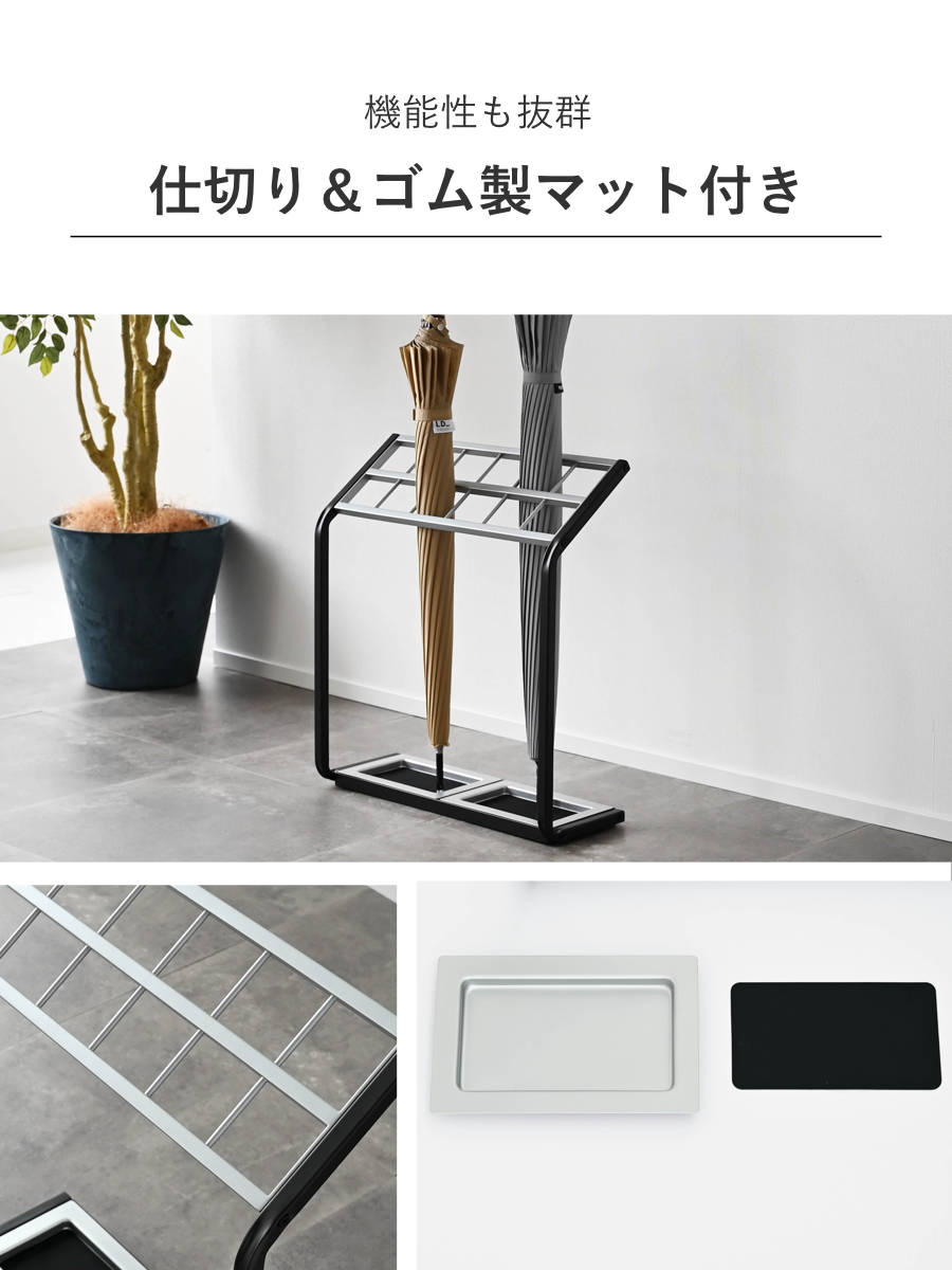 仕切りがついているので1本ずつの収納が可能です。また、傘を入れる部分が斜めになっているので出し入れがスムーズに行えます。底のトレーにはゴム製のマットがついているので、傘を入れるときに音が鳴りにくく、キズ防止にも効果的です。