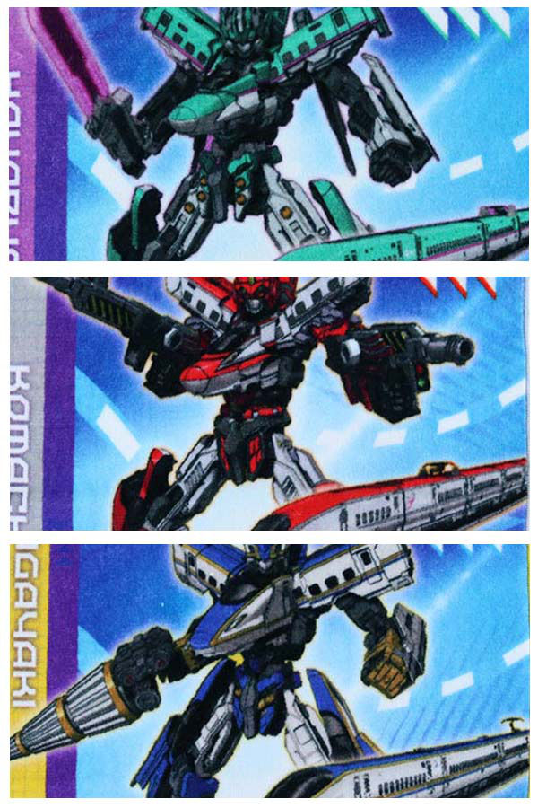 「新幹線変形ロボシンカリオン」のはやぶさ、こまち、かがやきのロボが描かれたカッコいいデザインです。持っているだけで通園、通学が楽しくなります。