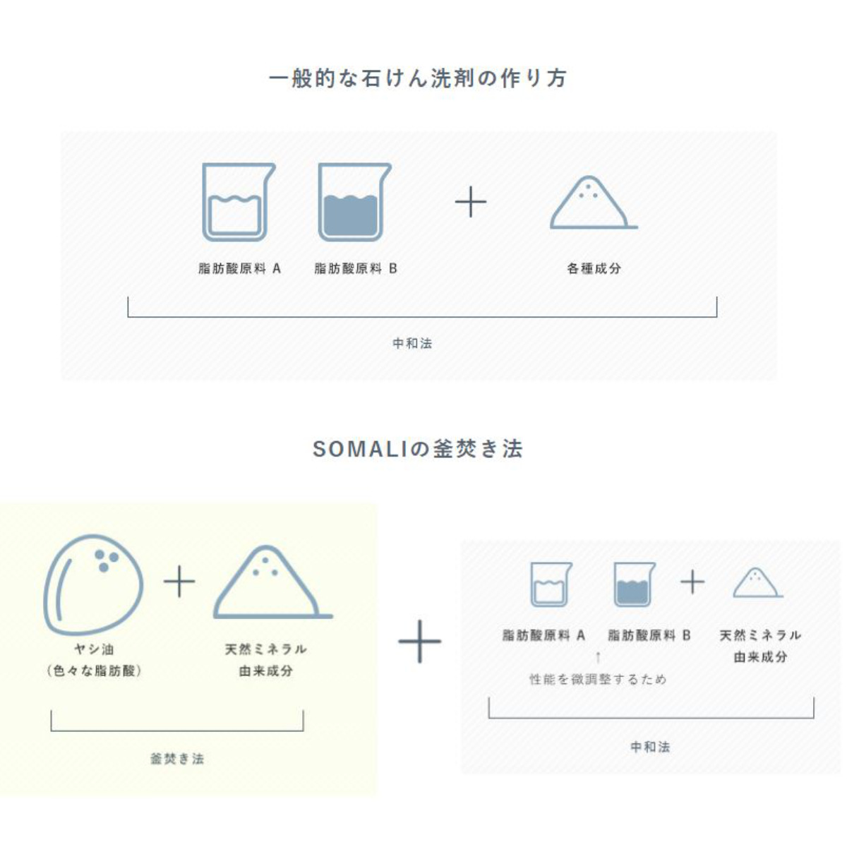 | 職人による昔ながらの製法 ヤシ油などの天然素材を使用した石鹸を作るには、昔ながらの製法で作るしかありません。手間と時間をかけて職人が造る絶妙なバランスで混ざり合った質のいい石鹸が出来上がります。 | 泡立ち、洗浄力へのこだわり ならではの色合い、香りをいかすために透明度にもこだわり抜かれています。泡立ちと洗浄力を保ちつつ、透明度を上げる為に何度も試行錯誤を繰り返し、今の【SOMALI】が誕生しました。 |