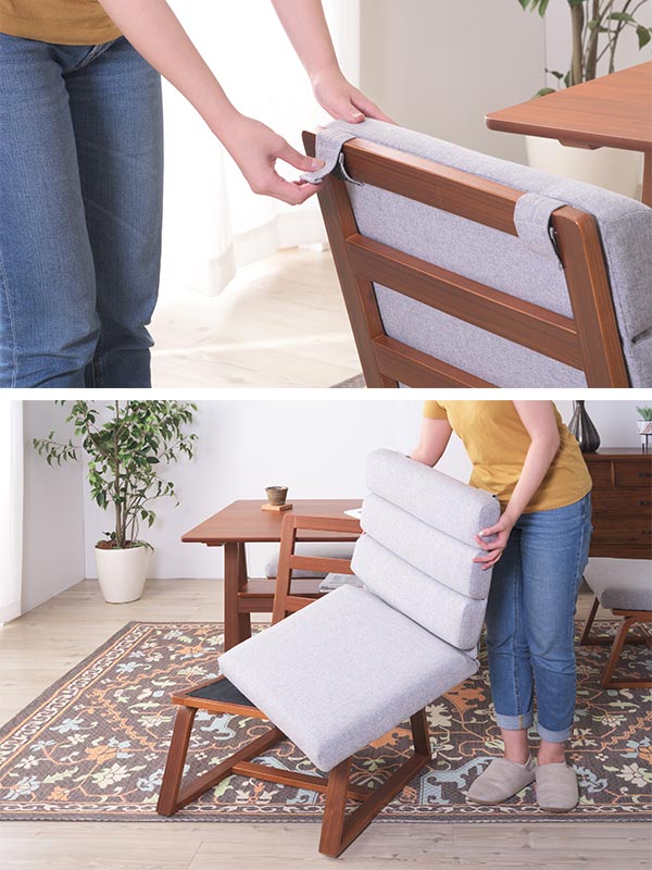 座面と背もたれが椅子に、面ファスナーで固定されているので、取り外しが可能です。