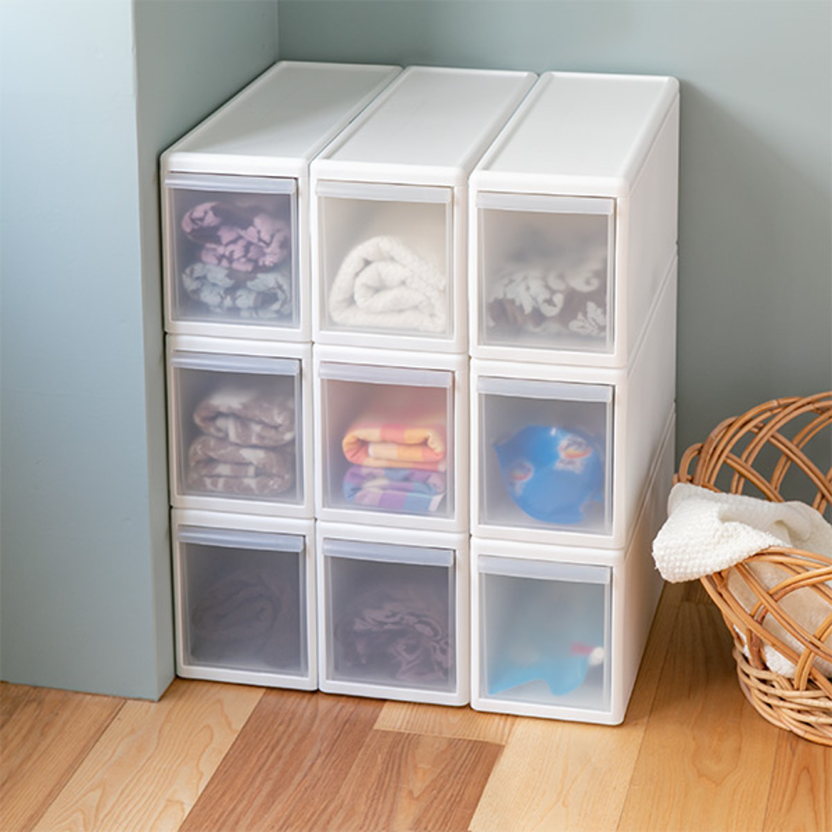 3種類の幅の異なる収納ケースでも積み重ねができるスタッキング構造で、自由にカスタマイズができます。無駄な空間を作らないブロック式構造なので、スッキリとした見た目です。MOSの収納ケースなら、スペースを有効活用したあなただけの「理想の収納」が作れます。