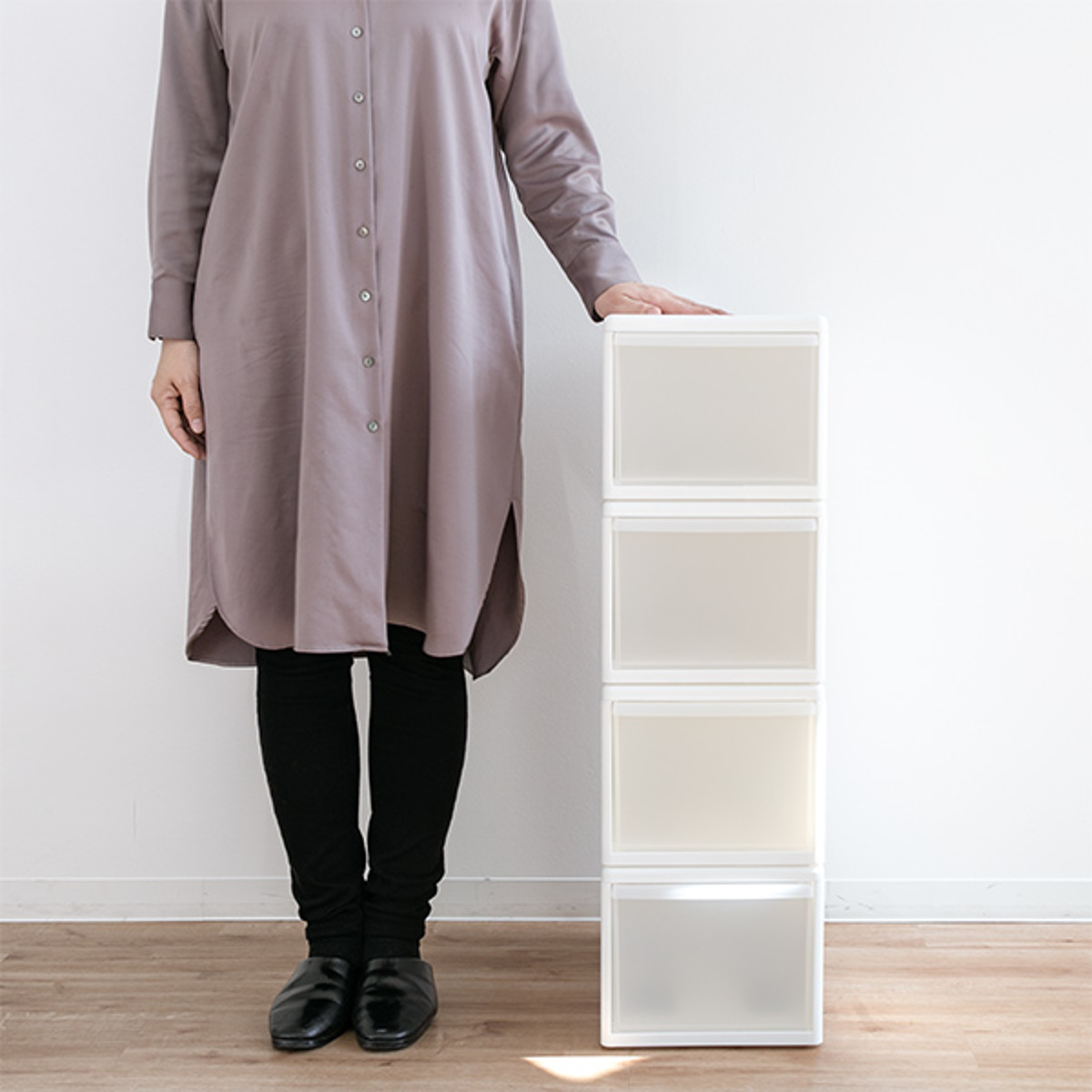 3種類の幅の異なる収納ケースでも積み重ねができるスタッキング構造で、自由にカスタマイズができます。無駄な空間を作らないブロック式構造なので、スッキリとした見た目です。MOSの収納ケースなら、スペースを有効活用したあなただけの「理想の収納」が作れます。