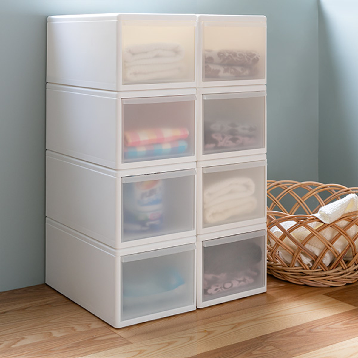 リビングや子供部屋、キッチンでのストック品の収納にもおすすめです。脱衣所ではタオルや下着、パジャマなどを入れておくと、入浴の際に必要なものを取りに行く手間が省けます。プラスチック製なので、水回りでの使用も安心です。シンプルかつベーシックな見た目は、置き場所を選ばず、どのお部屋に置いても使いやすいデザインです。