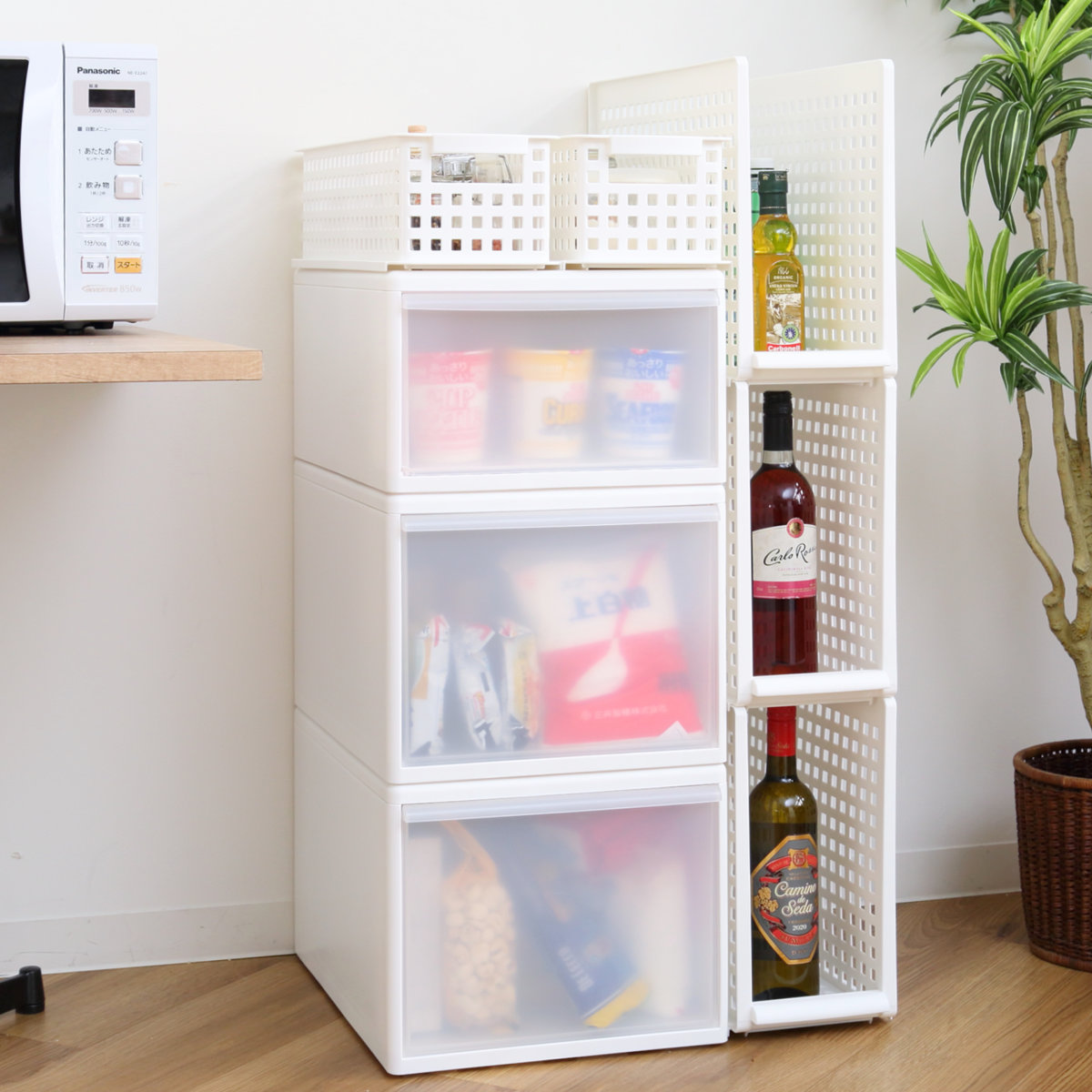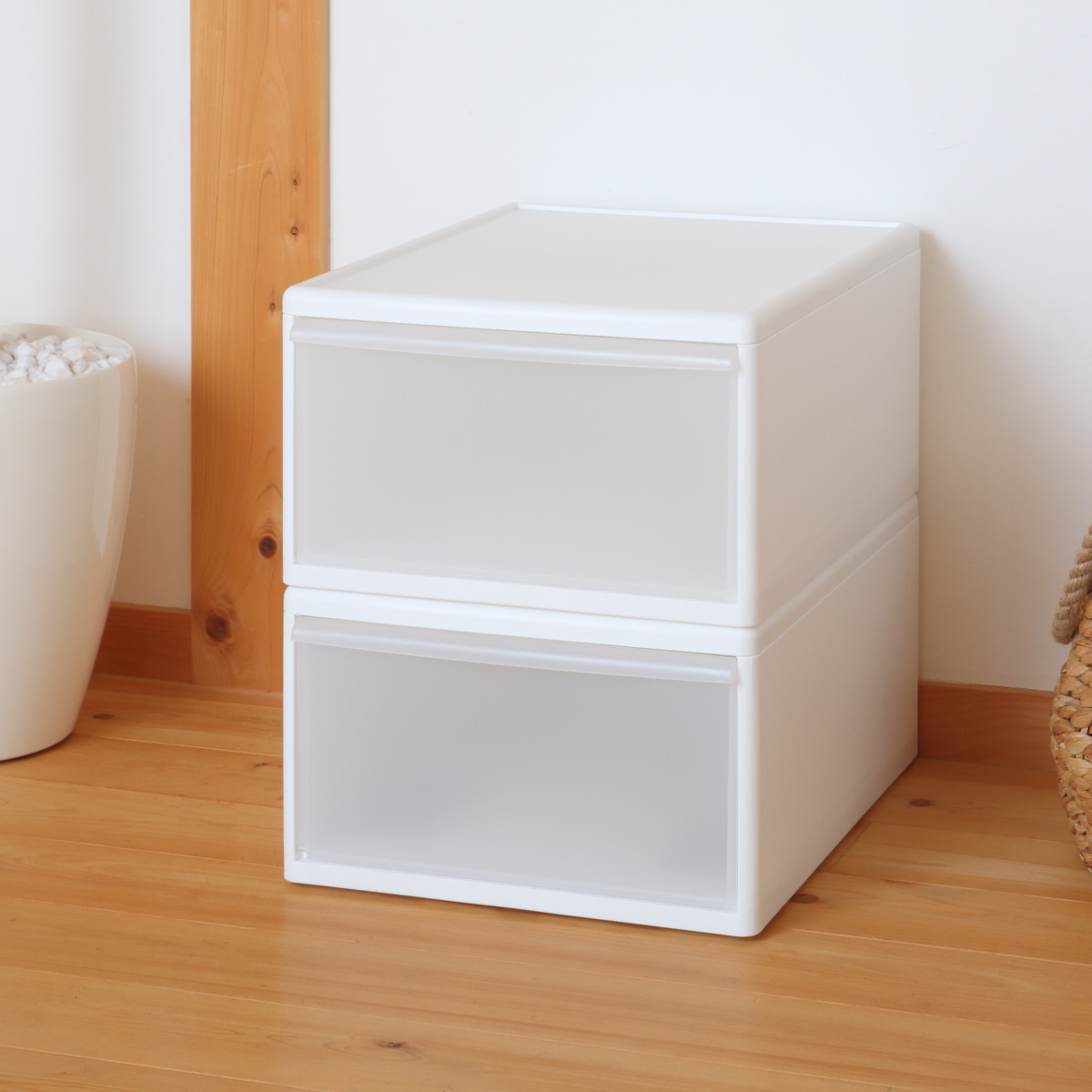 リビングや子供部屋、キッチンでのストック品の収納にもおすすめです。脱衣所ではタオルや下着、パジャマなどを入れておくと、入浴の際に必要なものを取りに行く手間が省けます。プラスチック製なので、水回りでの使用も安心です。シンプルかつベーシックな見た目は、置き場所を選ばず、どのお部屋に置いても使いやすいデザインです。