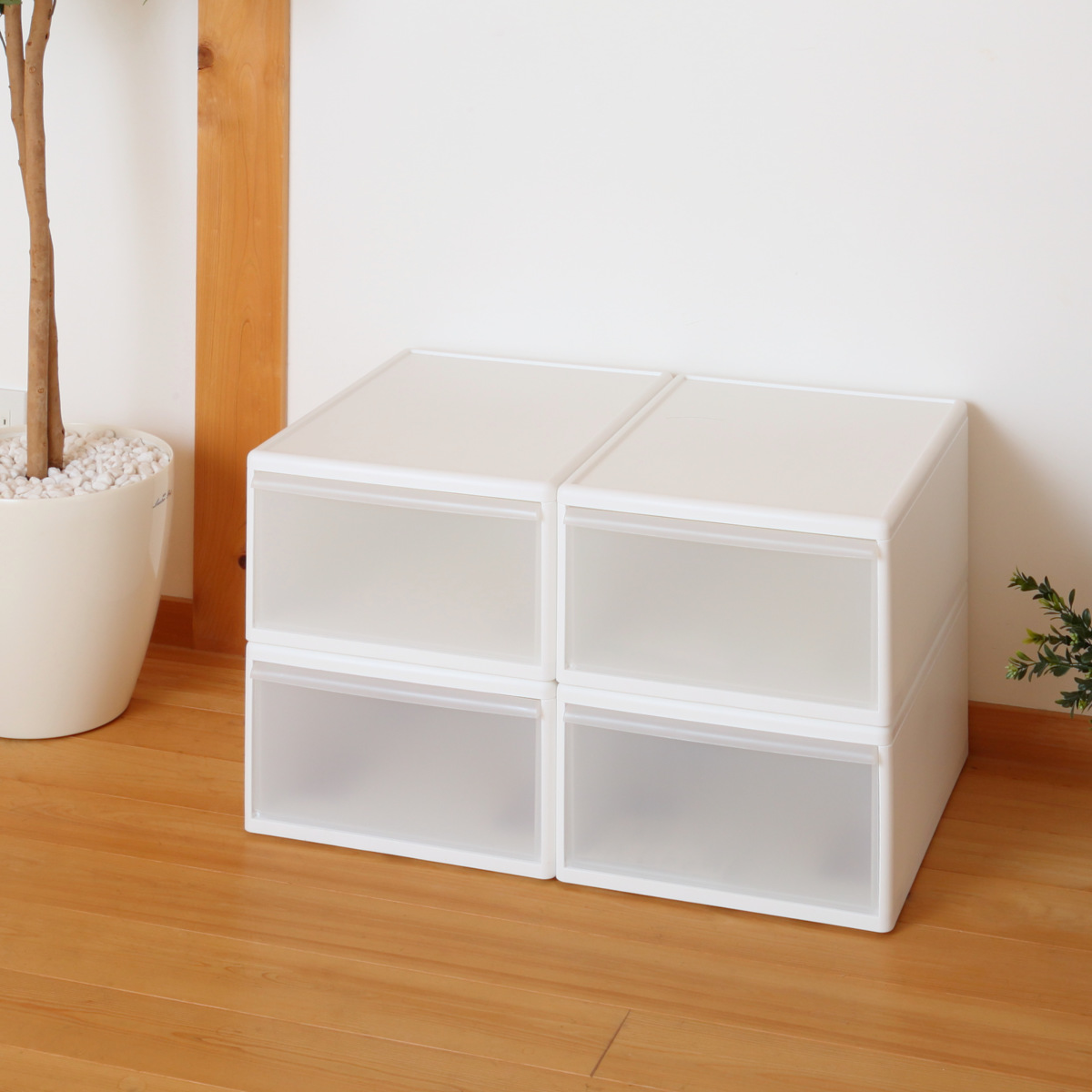 3種類の幅の異なる収納ケースでも積み重ねができるスタッキング構造で、自由にカスタマイズができます。無駄な空間を作らないブロック式構造なので、スッキリとした見た目です。MOSの収納ケースなら、スペースを有効活用したあなただけの「理想の収納」が作れます。