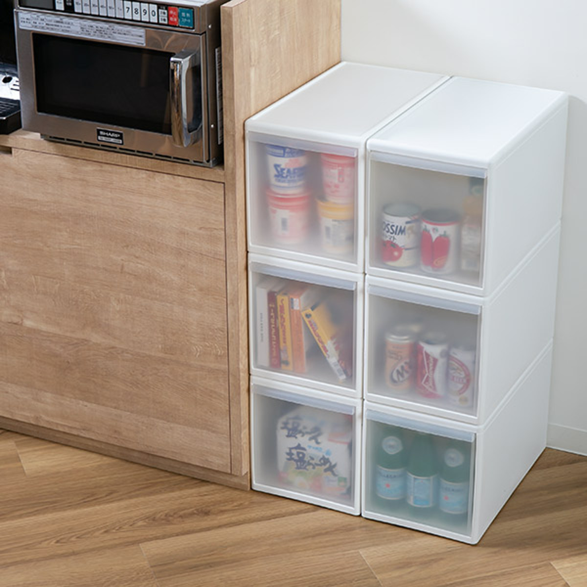 リビングや子供部屋、キッチンでのストック品の収納にもおすすめです。脱衣所ではタオルや下着、パジャマなどを入れておくと、入浴の際に必要なものを取りに行く手間が省けます。プラスチック製なので、水回りでの使用も安心です。シンプルかつベーシックな見た目は、置き場所を選ばず、どのお部屋に置いても使いやすいデザインです。