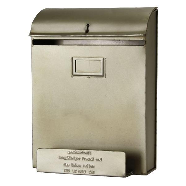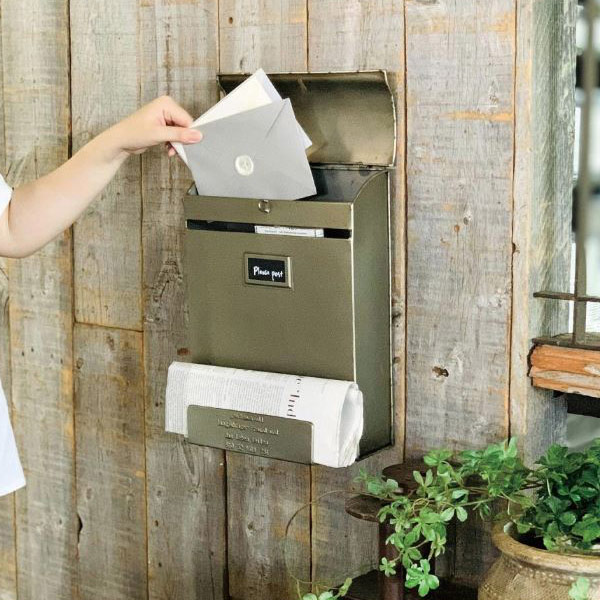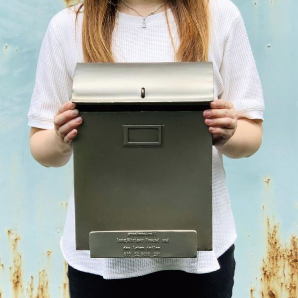 アンティーク風エンボスのロゴが魅力的な新聞受けです。ヨーロッパのアンティークショップでみつけたような味わい深い大人なデザインです。