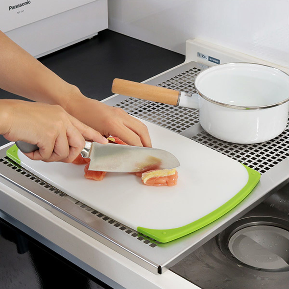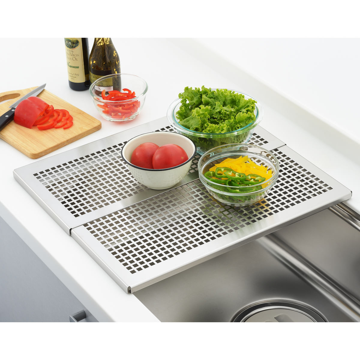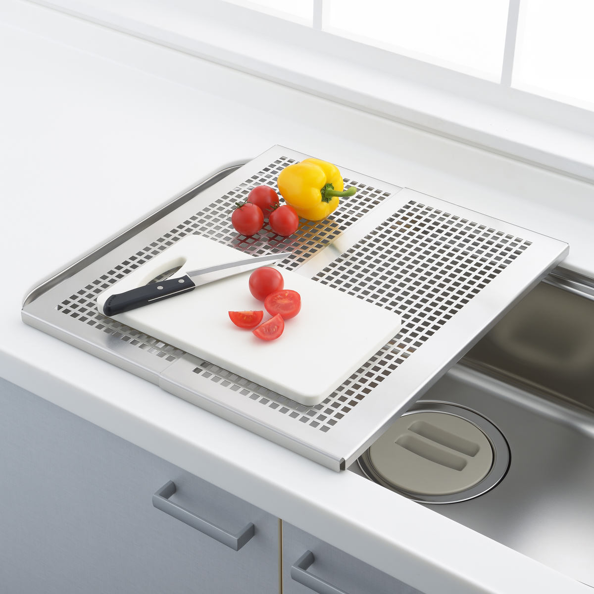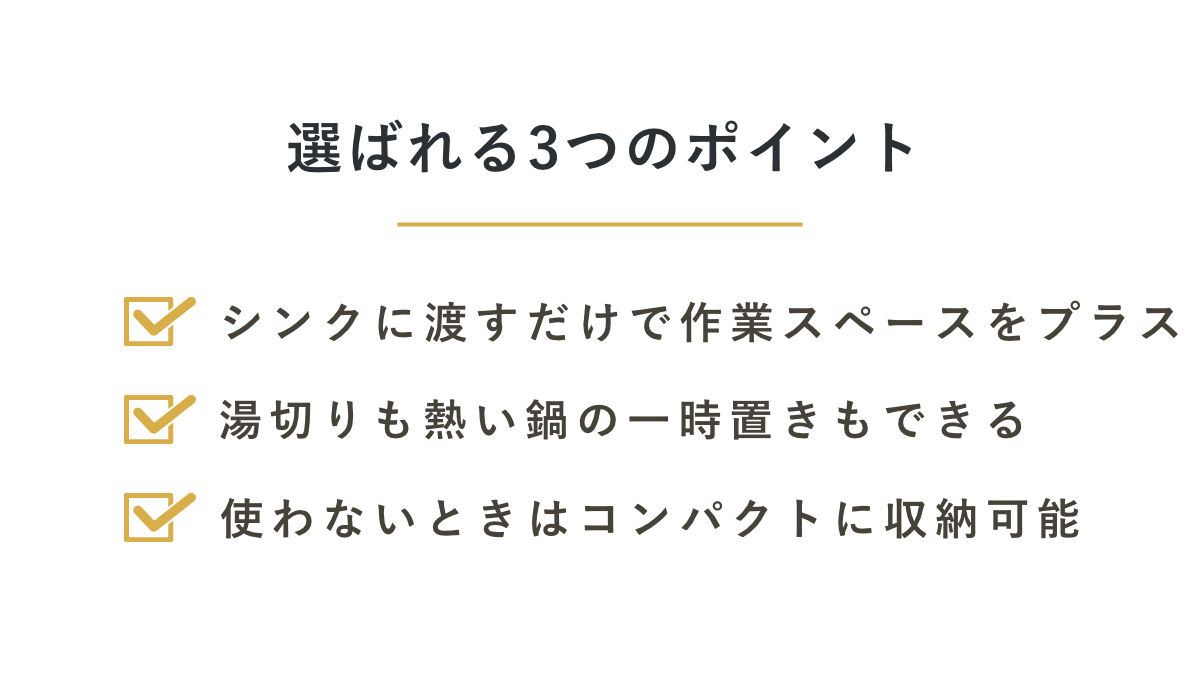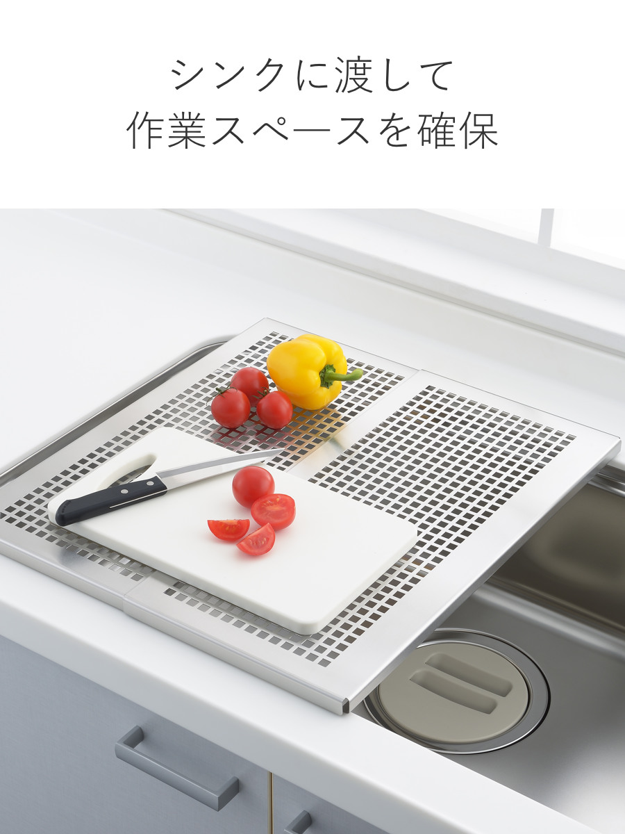 シンク上に設置するだけで作業のスペースを確保できる頑丈なスライドプレートです。盛り付けをする時にお皿を並べるスペースが欲しい、洗い物の量が多いから水切りスペースが欲しい、そんな時にシンクに設置すれば、簡単に作業台や水切りとして使用することができます。