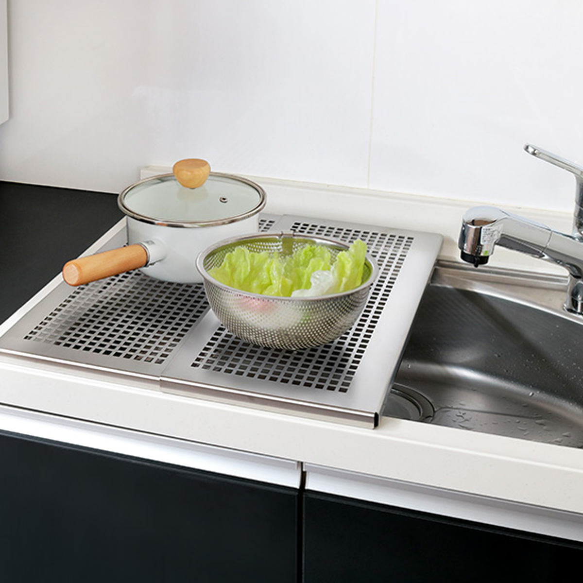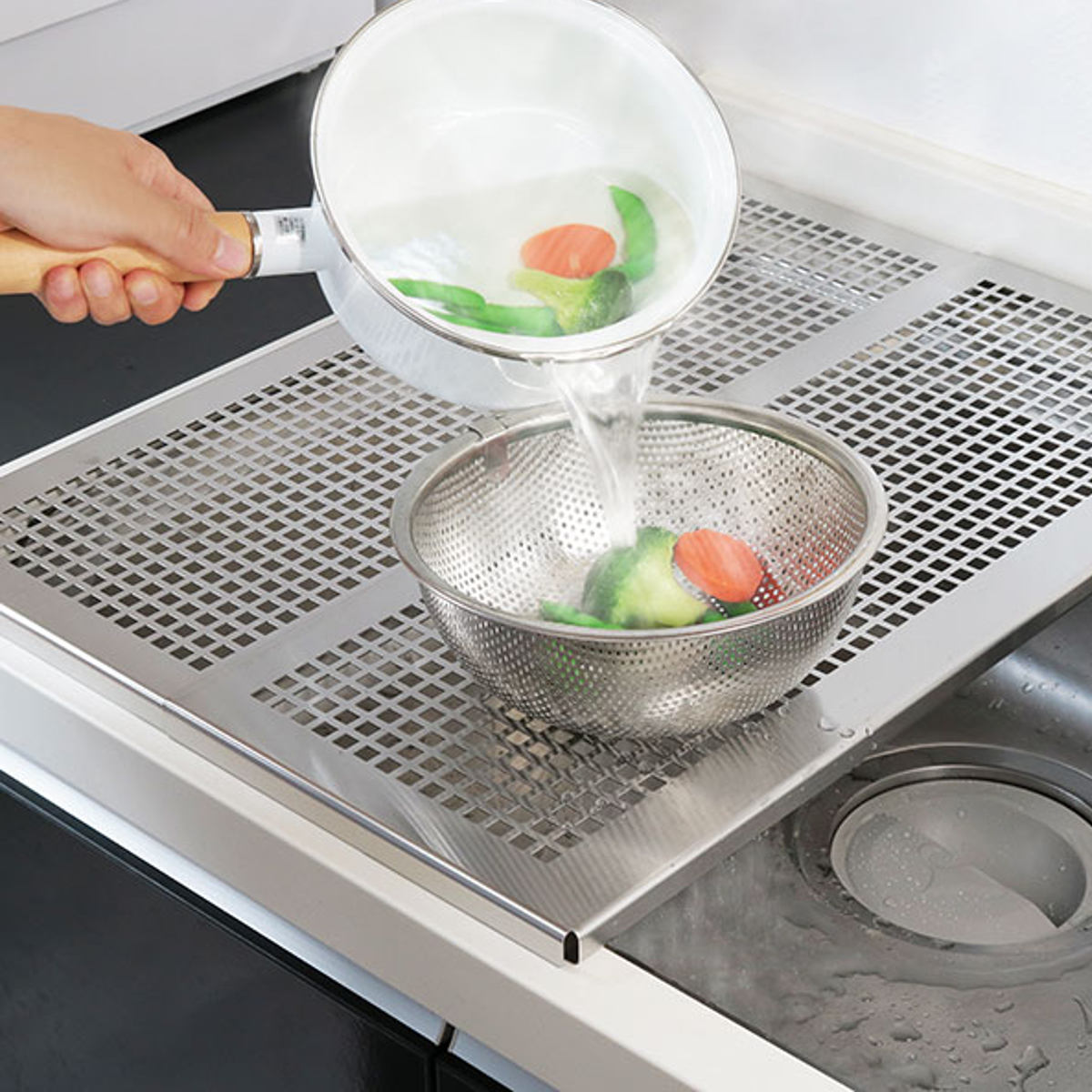 作業台や水切り、湯切りにも使えるステンレス製プレート