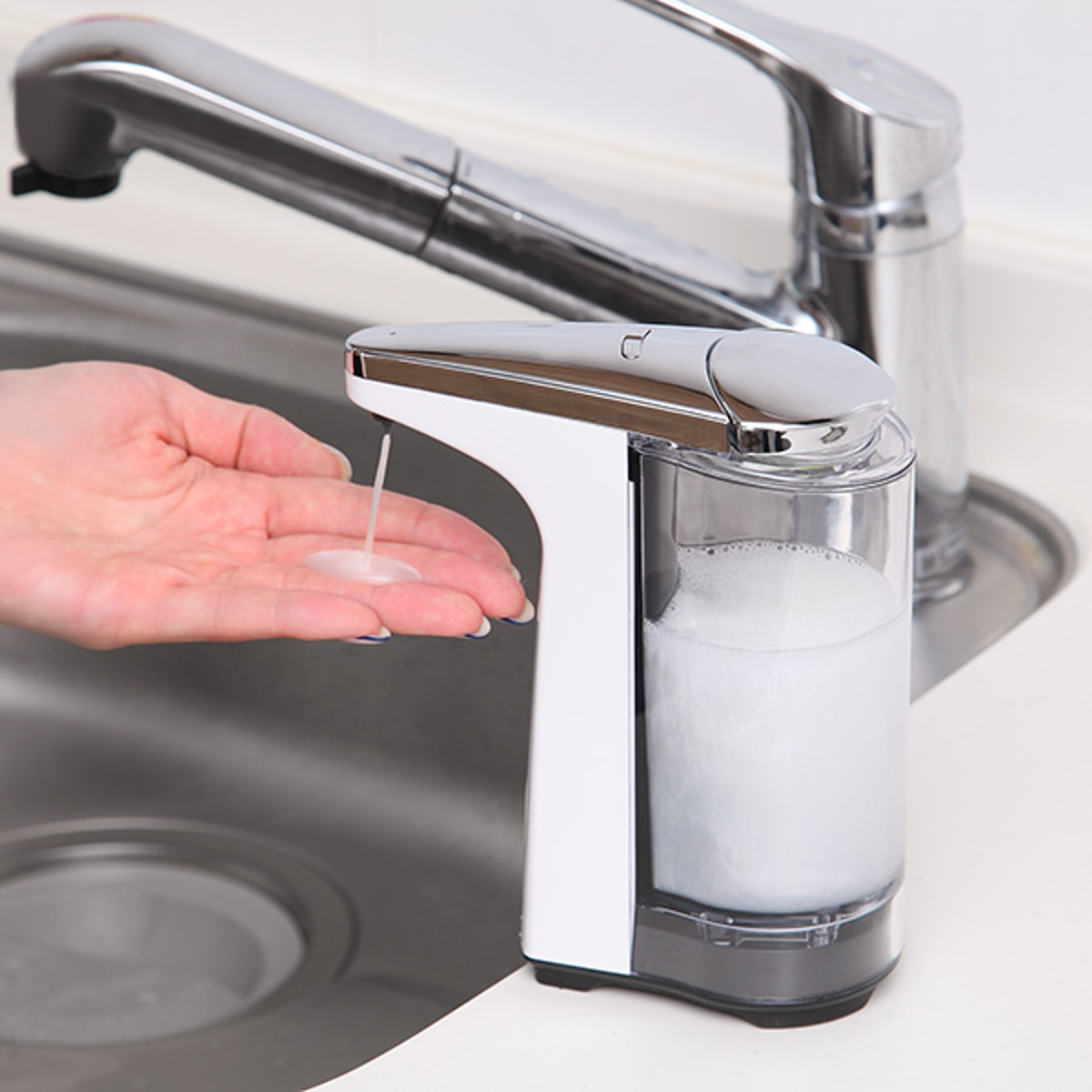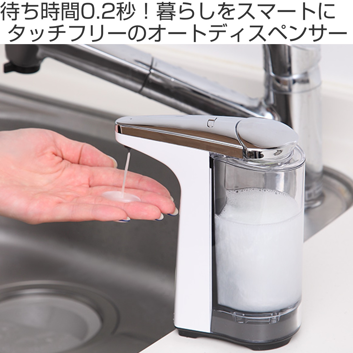 キッチンで食器用洗剤を入れておけば、スッとスポンジをかざすだけでセンサーが素早く感知します。待ち時間約0.2秒というスピードで適量の洗剤を出してくれるので、洗い物がスムーズになり作業もはかどります。