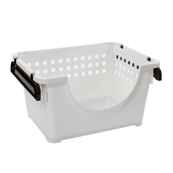 バスケット スタッキングバスケット 浅型 前開き ( スタッキング 収納ケース 収納ボックス 籠 カゴ クローゼット 収納ト 衣類 おもちゃ箱 プラスチック おもちゃ 玩具 収納用品 ぬいぐるみ 重ねる 重なる )【 ホワイトブラウン 】
