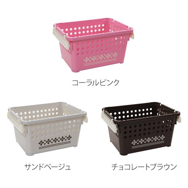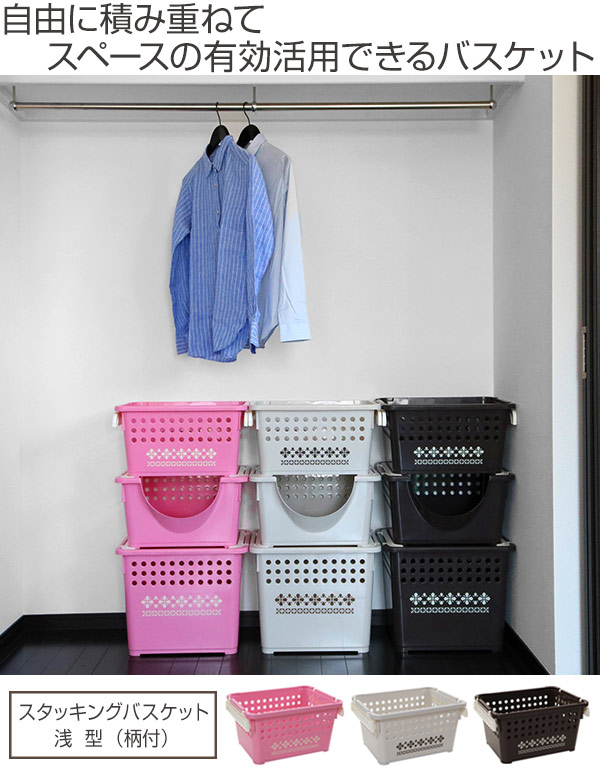 バスケット スタッキングバスケット 浅型 柄付 ( スタッキング 収納ケース 収納ボックス 籠 カゴ クローゼット 収納ト 衣類 おもちゃ箱 プラスチック おもちゃ 玩具 収納用品 ぬいぐるみ 重ねる 重なる ) 【 コーラルピンク 】