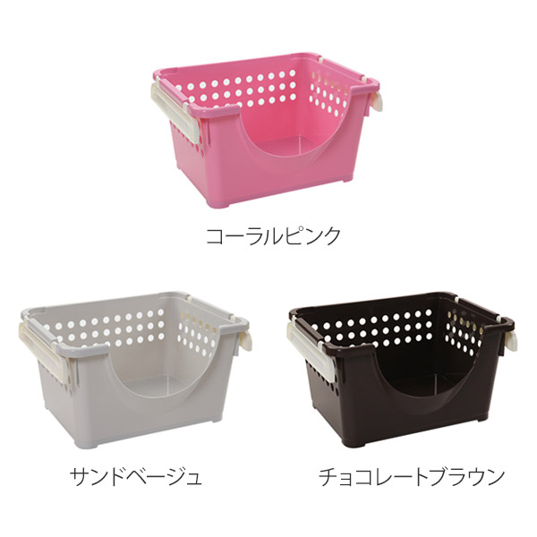 バスケット スタッキングバスケット 浅型 前開き 取っ手ホワイト ( スタッキング 収納ケース 収納ボックス 籠 カゴ クローゼット 収納ト 衣類 おもちゃ箱 プラスチック おもちゃ 玩具 収納用品 ぬいぐるみ 重ねる 重なる ) 【 コーラルピンク 】