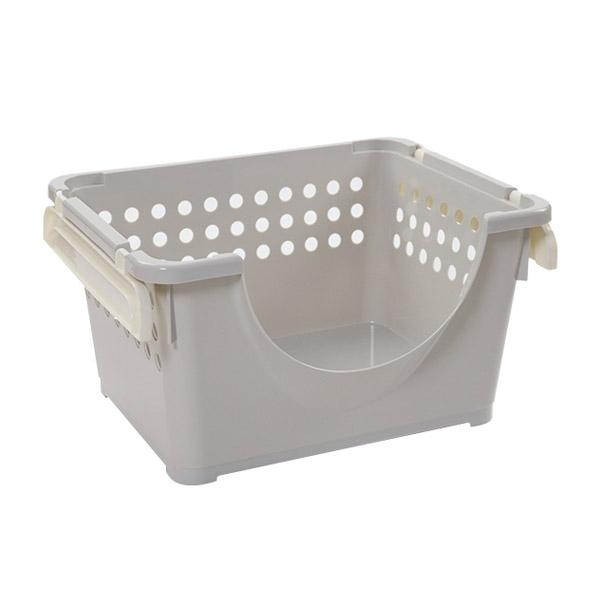 バスケット スタッキングバスケット 浅型 前開き 取っ手ホワイト ( スタッキング 収納ケース 収納ボックス 籠 カゴ クローゼット 収納ト 衣類 おもちゃ箱 プラスチック おもちゃ 玩具 収納用品 ぬいぐるみ 重ねる 重なる ) 【 サンドベージュ 】