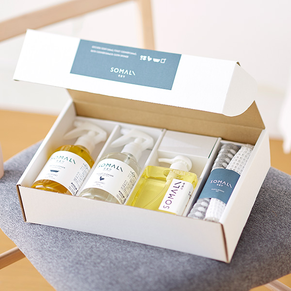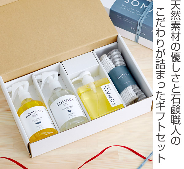 石けんの良さを最大限に引き出した【SOMALIシリシリーズ】の、便利な水回りのお掃除セットです。台所石けんとバスクリーナーは天然オレンジオイル、トイレクリーナは天然ラベンダーの香りなので、お掃除中も香りも楽しむ事ができます。安心の日本製なので、出産祝いや御新築祝い、内祝い等のギフトにおすすめです。