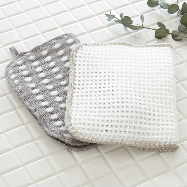 泡立ち・泡もちが良い布型スポンジ2枚入りです。洗いやすい厚手の仕上りながらも、メッシュ状に織られているので乾きが早く衛生的です。グレーのスポンジにはアクリルが織り込まれ、焦げ跡などの頑固な汚れも落としやすくなっています。ホワイトのスポンジは柔らかな綿が織り込まれているので、繊細な食器を洗うのに最適です。