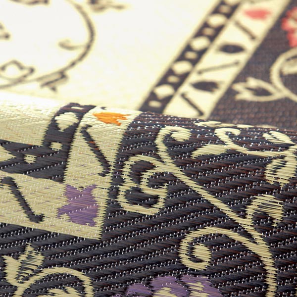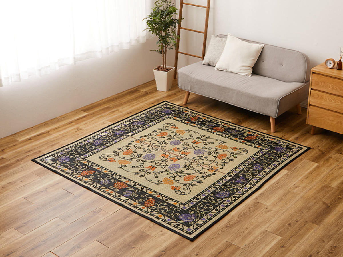 1枚あるだけで、お部屋に華を添えてくれます。牡丹唐草文様を思わせる、どこかオリエンタルな雰囲気の花模様が美しい「イ草」ラグです。