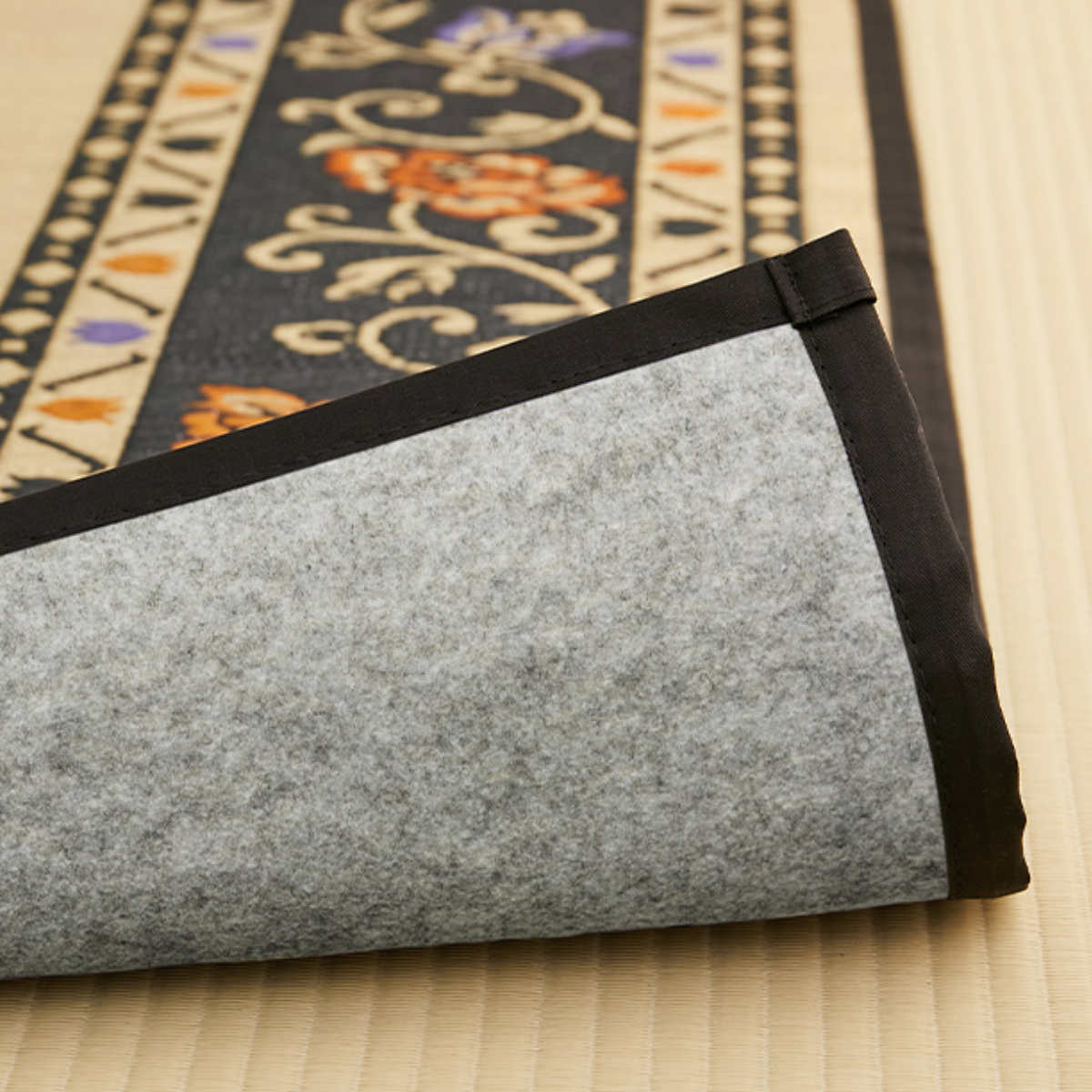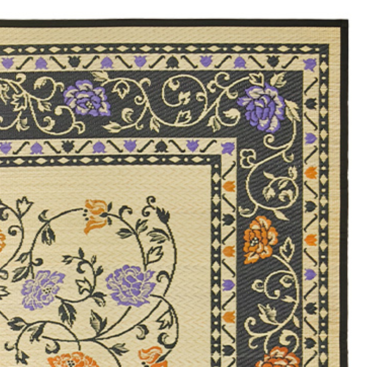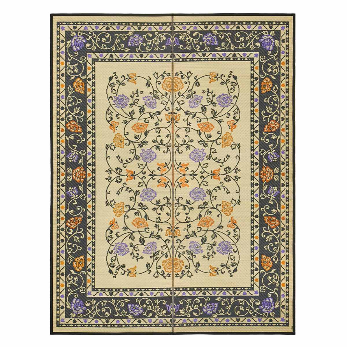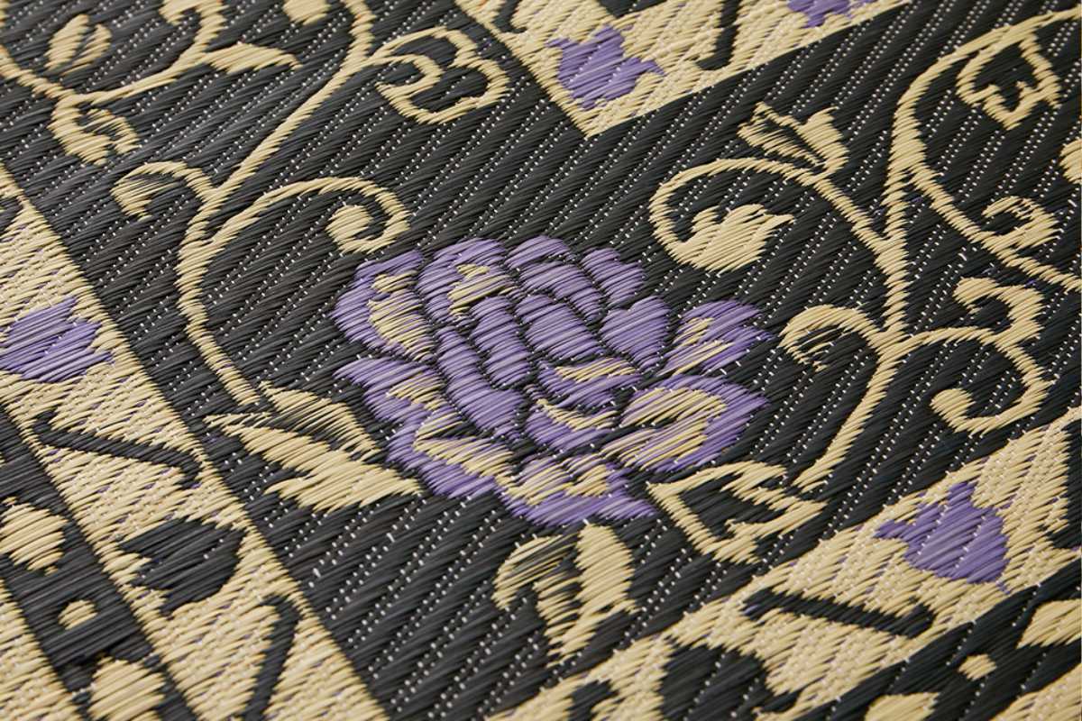 1枚あるだけで、お部屋に華を添えてくれます。牡丹唐草文様を思わせる、どこかオリエンタルな雰囲気の花模様が美しい「イ草」ラグです。