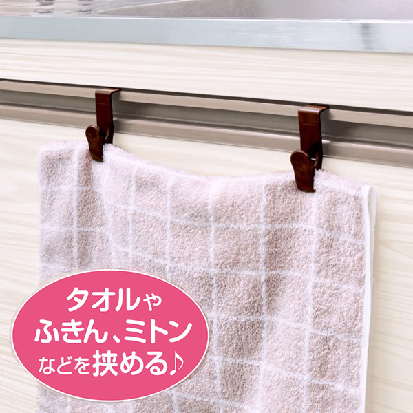 ●扉や引き出しに掛けて使うクリップです。タオルやふきんなどを挟んで使うのに便利です。
