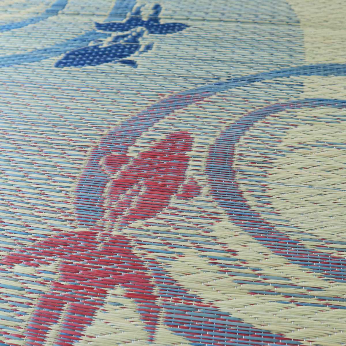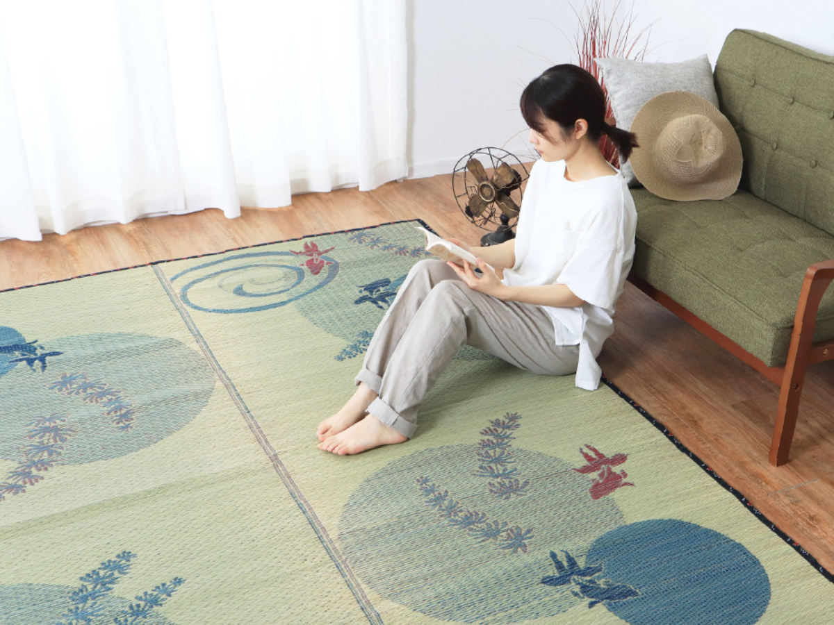 金魚と水紋をあしらったデザインは、サラリとした手触りが涼しさを演出します。2畳用のサイズはラグとして部分敷気にも使えるサイズです。畳の気になる箇所だけ敷いたり、フローリングの上にラグの代わりに敷いたり、様々なシーンにお使いいただけます。