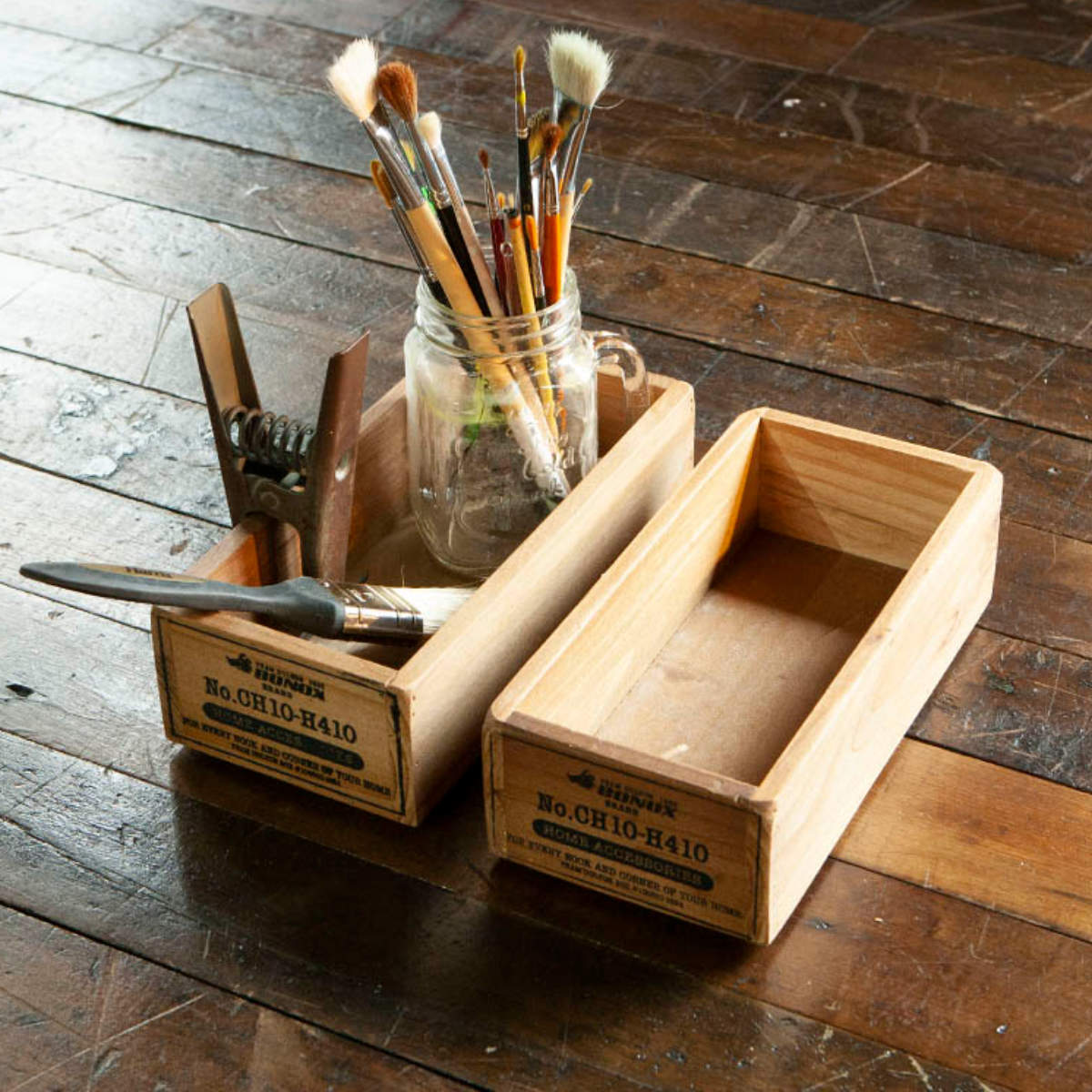 ありがちなプラスチック製品で間に合わせるのではなく、アンティーク風な雰囲気が魅力の木製ボックスに収納することでお部屋がおしゃれな空間になります。デスク、キッチン等様々なシーンで活躍します。日々増していく味わいも見ものです。