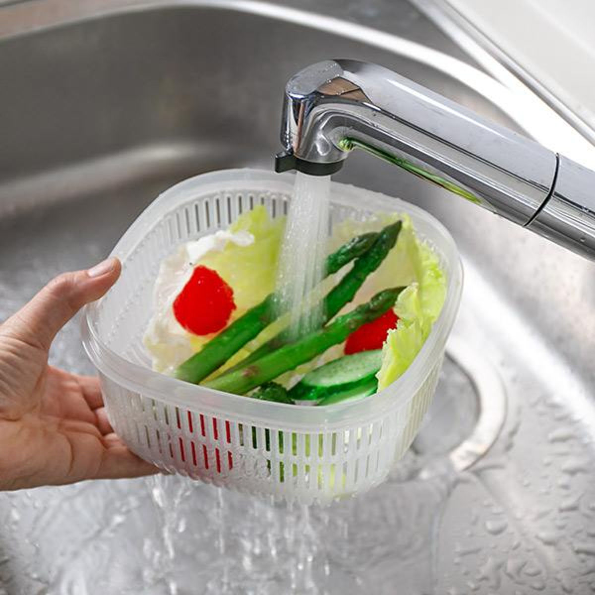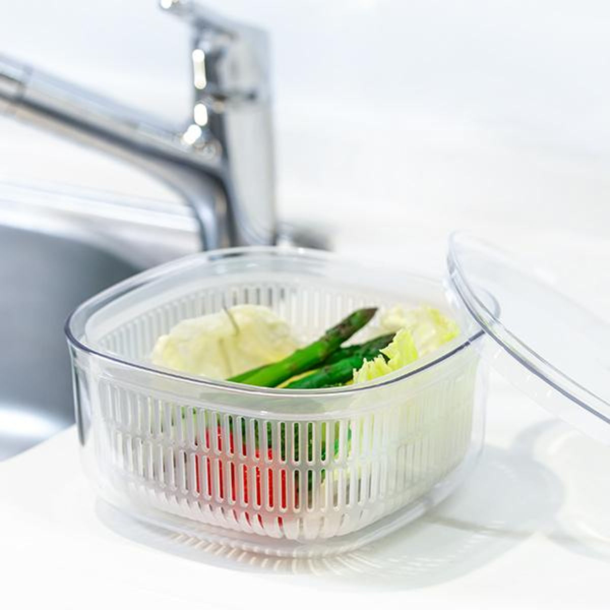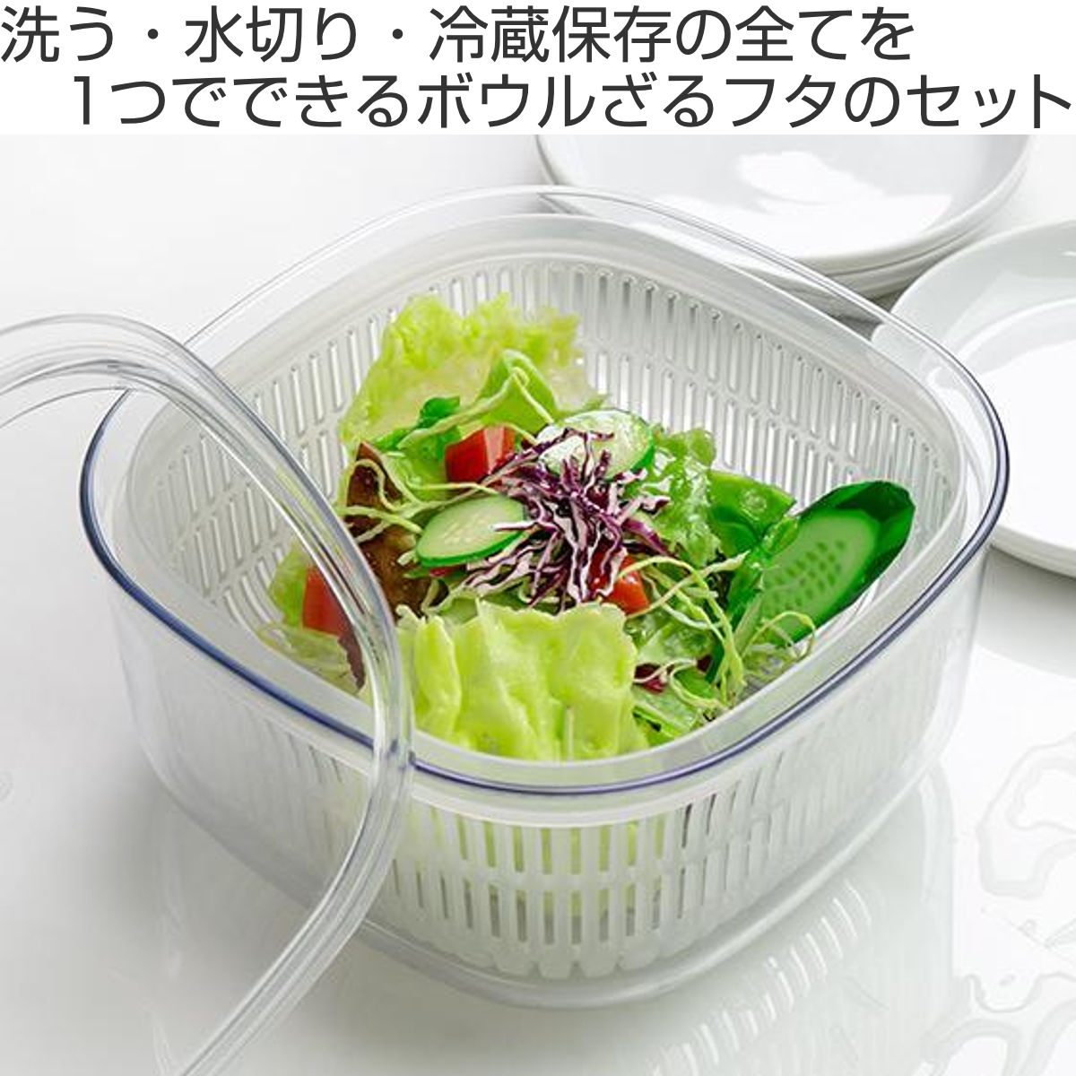手軽に食べたい野菜などを「洗う・水切り・保存」できる、ボウルとざるとフタのセットです。フタとボウルは透明度が高い容器で、冷蔵庫に入れたままでも中身や野菜の鮮度が一目でわかるので、家庭内の食品ロスを防げます。