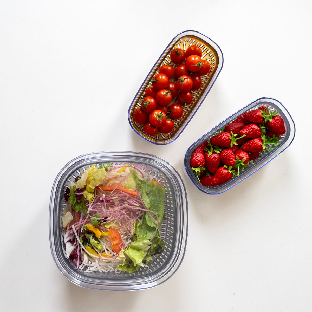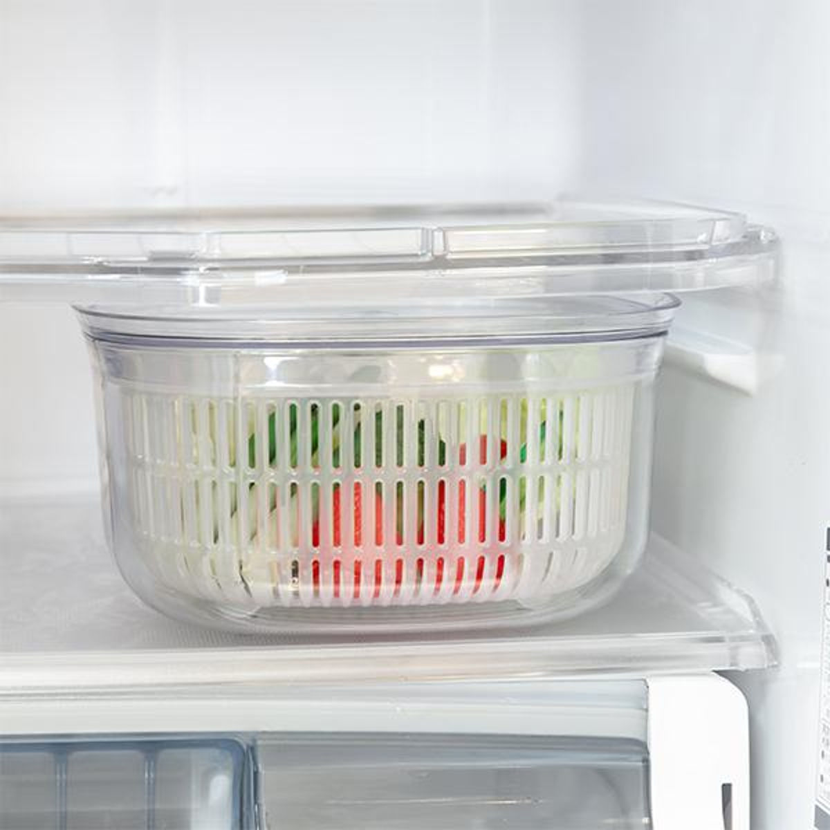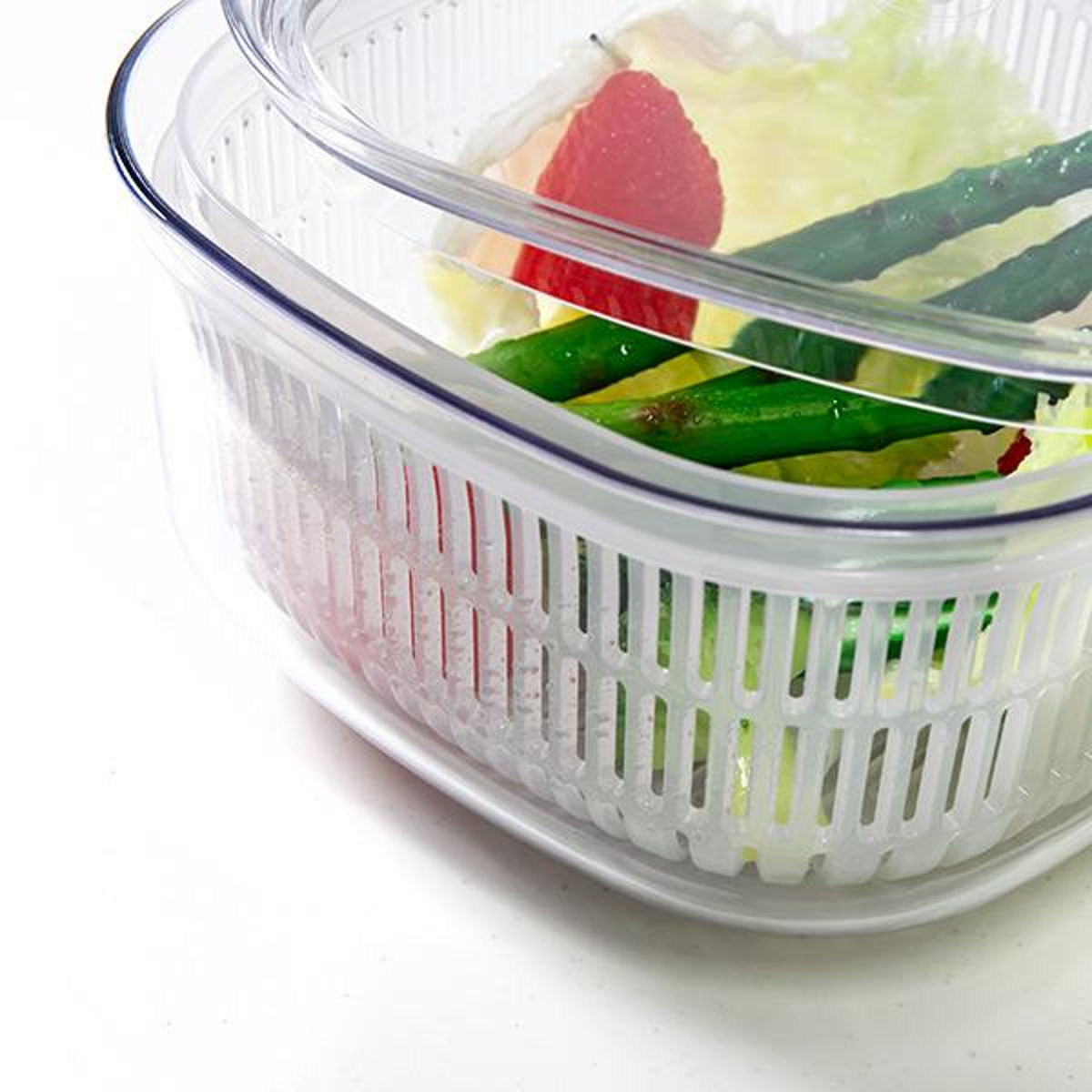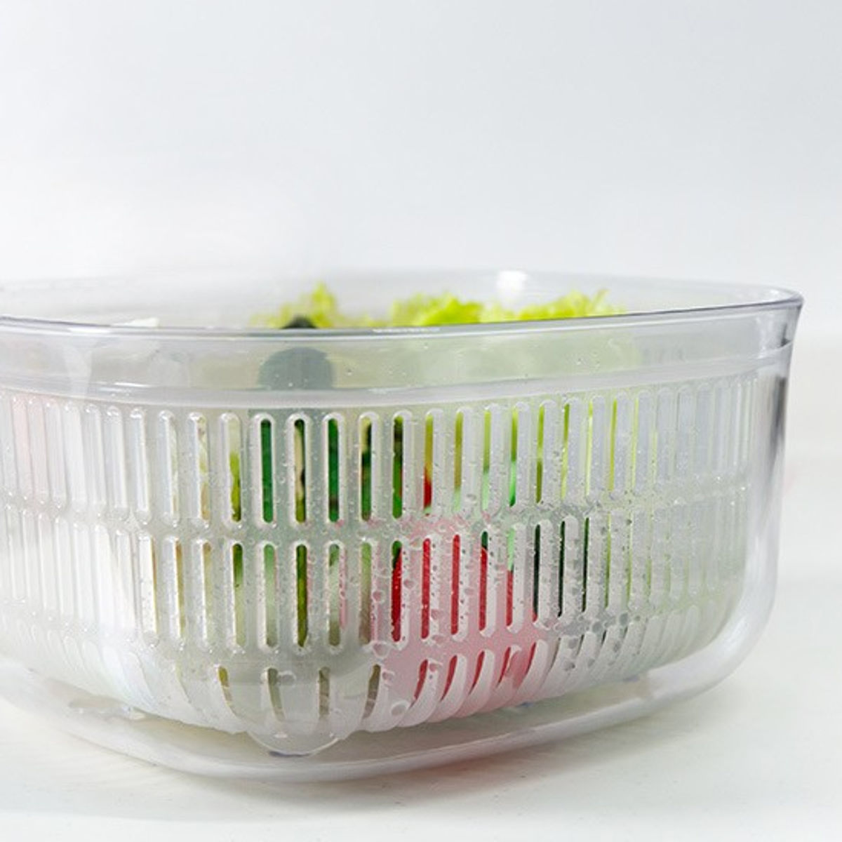 手軽に食べたい野菜などを「洗う・水切り・保存」できる、ボウルとざるとフタのセットです。フタとボウルは透明度が高い容器で、冷蔵庫に入れたままでも中身や野菜の鮮度が一目でわかるので、家庭内の食品ロスを防げます。