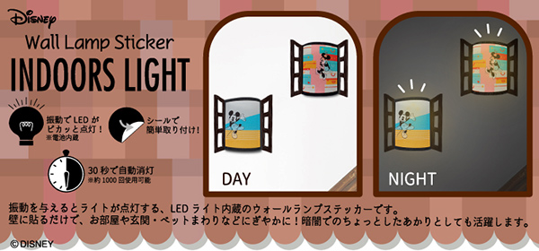 振動を与えるとライトが点灯する、ティガーのウォールランプステッカーです。壁に貼るだけで、お部屋や玄関、ベットまわりなどがにぎやかになります。暗闇でのちょっとした灯りとしても活躍します。