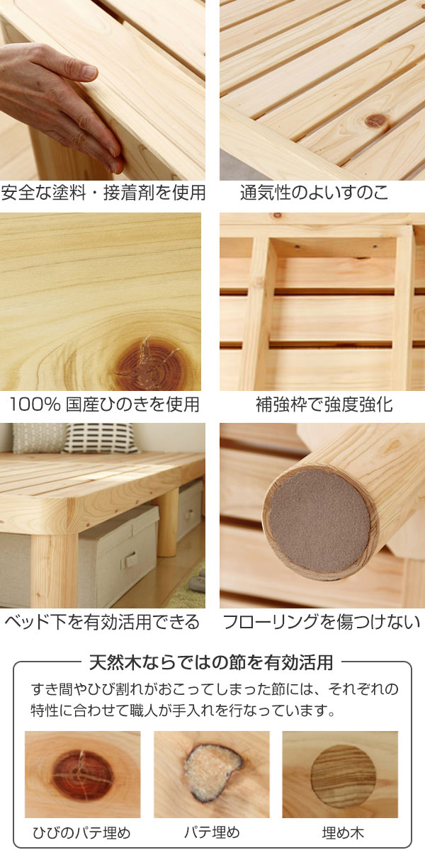 爽やかなひのきの香りと、すのこの通気性で快適な眠りをサポートします。フレームの角と脚が丸い、シンプルで飽きのこないデザインで、長くご愛用いただけます。