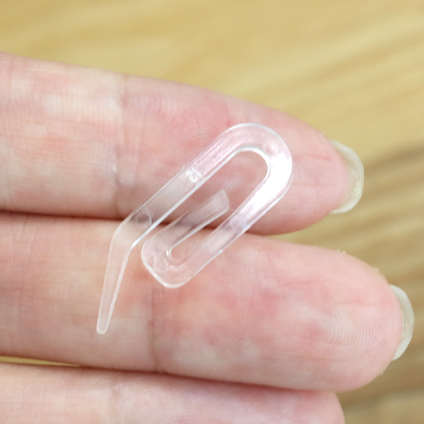 フックの取り付けはとても簡単、くるっとまわしながら穴に通すだけです。上の段、下の段、どちらにつけるかで通常カーテンのAフック、Bフックのようになります。また、ギャザーテープの紐を左右に引っ張ることでお好みのヒダを作って楽しむこともできます。
