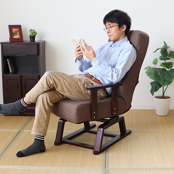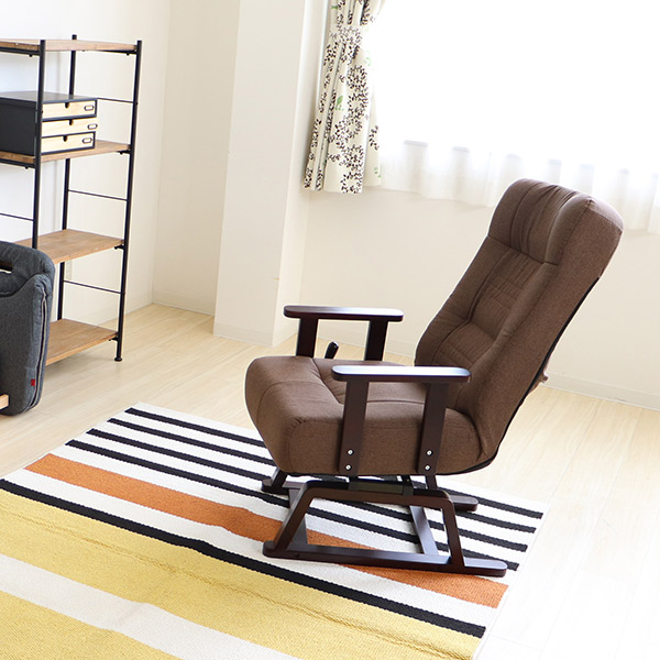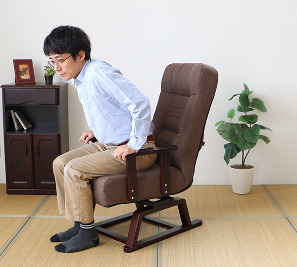 背もたれはリクライニング、座面は回転することができる多機能な高座椅子で、一番リラックスできる体勢に合わせて調節してお使いいただけます。左右45度ずつの回転が出来るので、テーブルがあっても楽に立ち上がることが出来ます。
