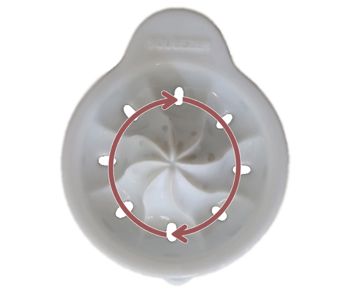 矢印の方向に食材を動かすと軽い力で搾ることができます。種を取り除き、果汁だけが受け鉢に落ちるようになっています。受け鉢は片口付きで、ドレッシングなどを作ってお料理にかける際に便利です。