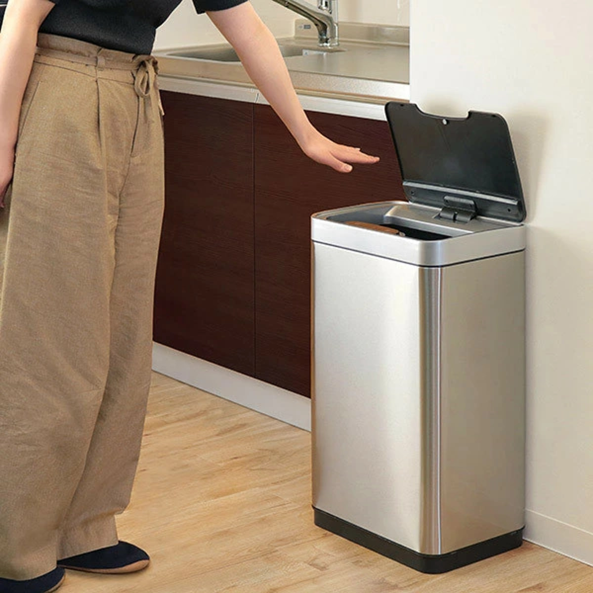 手をかざすだけで開くセンサー式のゴミ箱です。センサーはゴミ箱の上部に反応し、前を通っただけでは反応しにくいので、必要でないときに不意にふたが開く、というわずらわしさがありません。