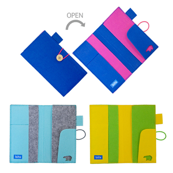ボタン一つで簡単に留められます。内側のレーザーカットのシロクマがワンポイントです。カラーはライトブルー、ブルー、イエローの3色展開で、ビビッとな配色が目を引きます。