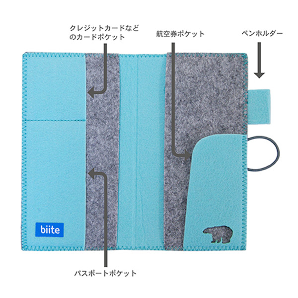 開いて左側にはカードやパスポートを入れられるポケットが付いています。右側には長い航空チケットが折らずにそのまま入れられる縦長のポケットが付いています。ペンホルダーもついているのでとても便利です。