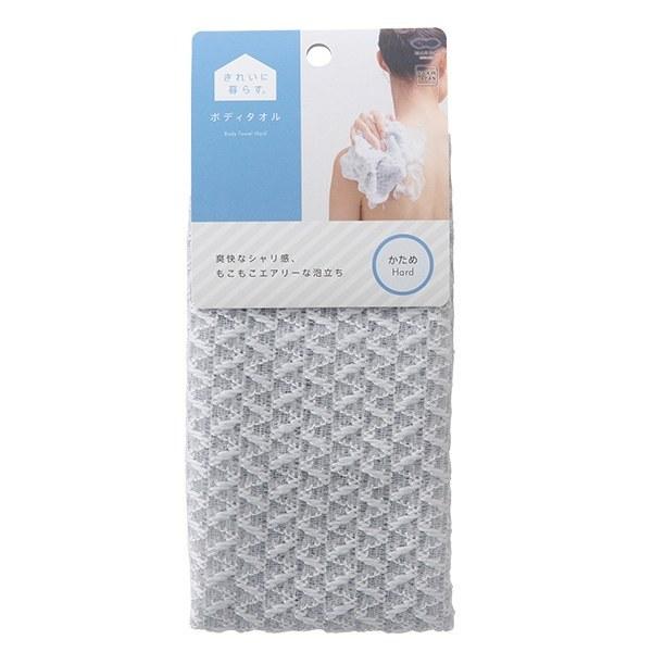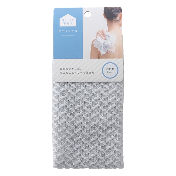 「きれいに暮らす。」シリーズのボディタオルです。エアリーな泡質でスッキリと洗い上げます。多少の刺激を好まれる方にピッタリな、かためのボディタオルです。